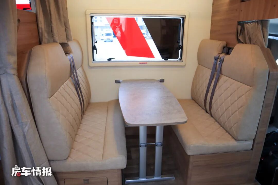 会客区是采用了四人对卡座沙发+可移动餐桌的设计,带有四条安全带,结合主副驾驶座椅,整辆车可以满足一家六口人的乘坐需求。晚上还可以拼接成一张小型的沙发床。