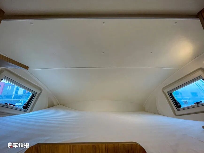 驾驶室顶部的额头休息区是提供了一张基础的双人床,两侧带有小型的外推窗,能够保障一定的通风和采光,后期有需要也可选装天窗。
