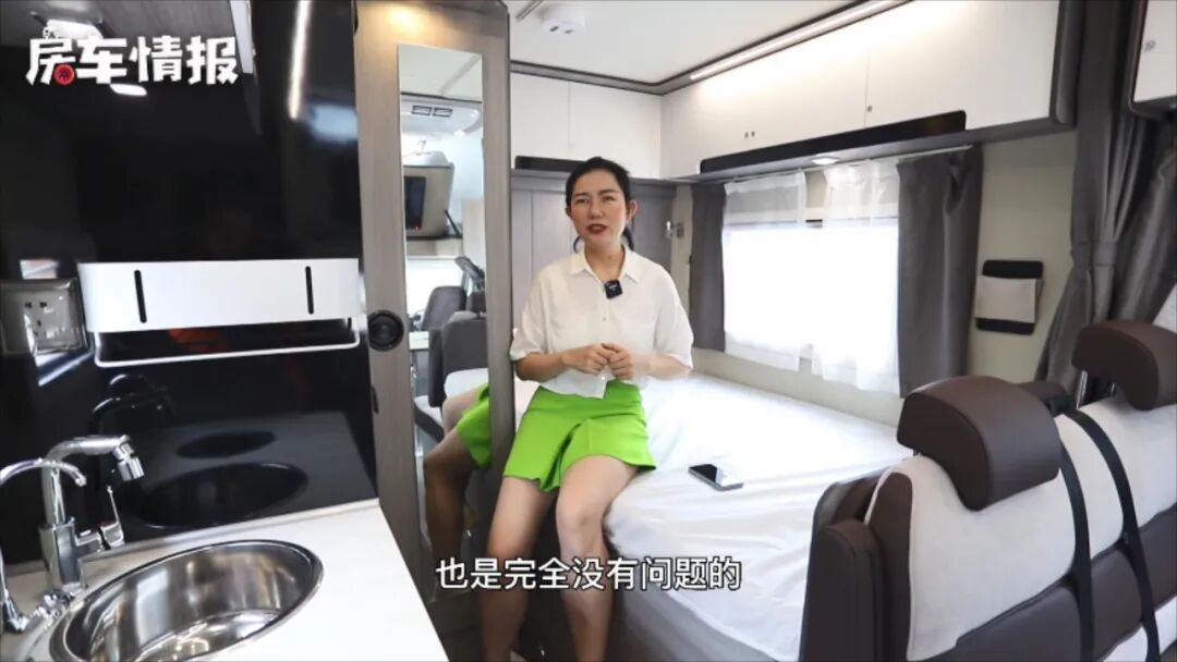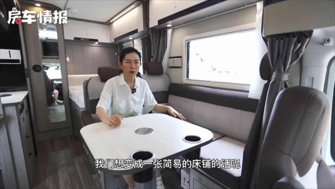 车内采用了一个比较经典的布局样式,前方为沙发会客区,后方为主卧休息和厨卫区域,整车可以满足一家四口人住宿,另外这款车还支持客户继续一些相对个性化的定制,如水电、座椅数量等。