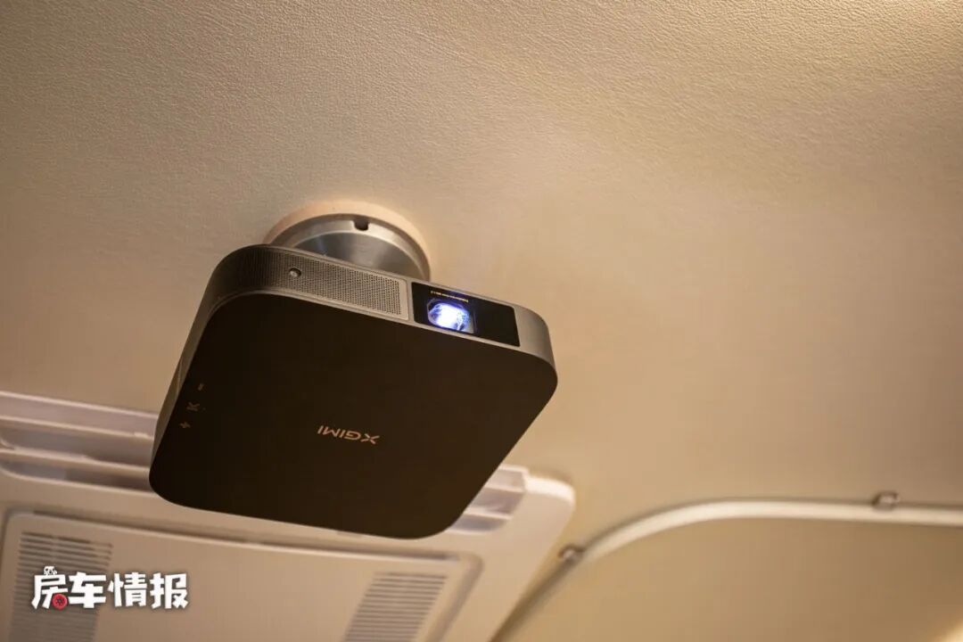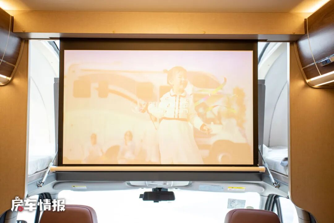 那么这张床铺的尺寸也达到了2100*1500mm,完全可以轻松的睡下两个成年人。床板下方不仅提供了一台标配的电视,而且整辆车还配置了投影仪和幕布,这样在夜晚的时候也能够将车内打造成一个小型的私人电影院。