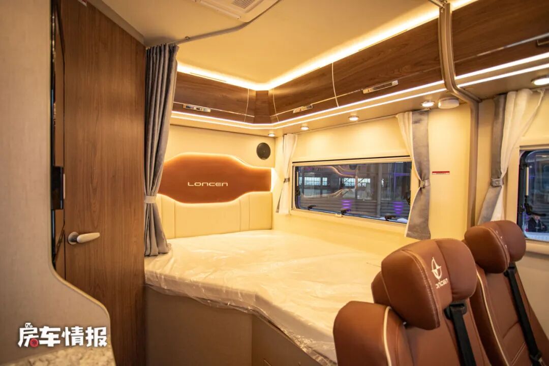 车内的休息区有两处,一处是在车尾部,一处是在驾驶室顶部的额头区域内,先来看看尾部的床吧,这是一张尺寸为1900*1350mm的双人纵床,平时完全可以满足两个人睡卧的需求,另外床头处还带有软包的设计,整个天花板也加入了氛围灯,营造出了非常适合睡眠的气氛。而且侧面也设计了一扇超大尺寸的观赏窗,为整个区域增加了采光和通透性。