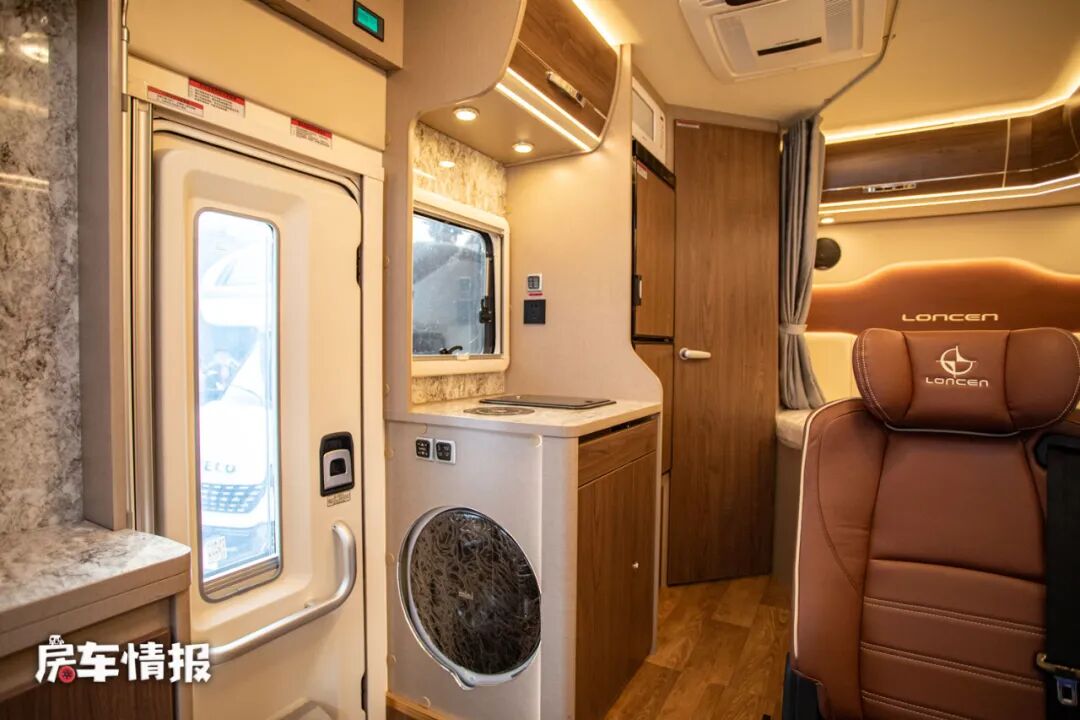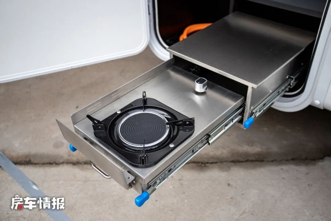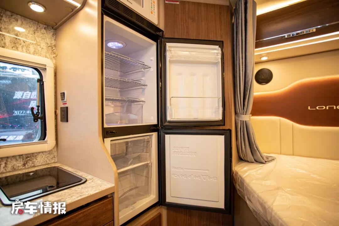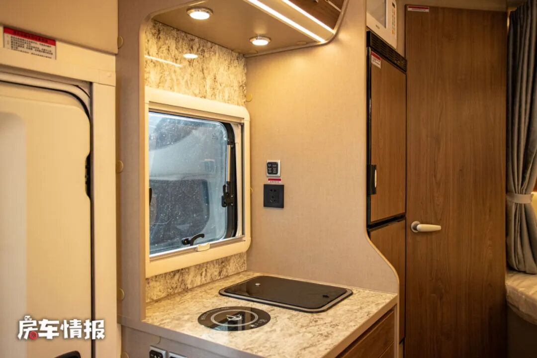 厨房区依然位于乘客门后方,尺寸并不是很大,带有一个基础的电磁炉和不锈钢水槽,后方则是一台微波炉和一台148L的双开门冰箱,能够满足日常的烹饪需求。