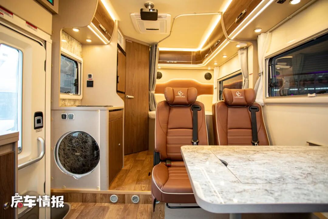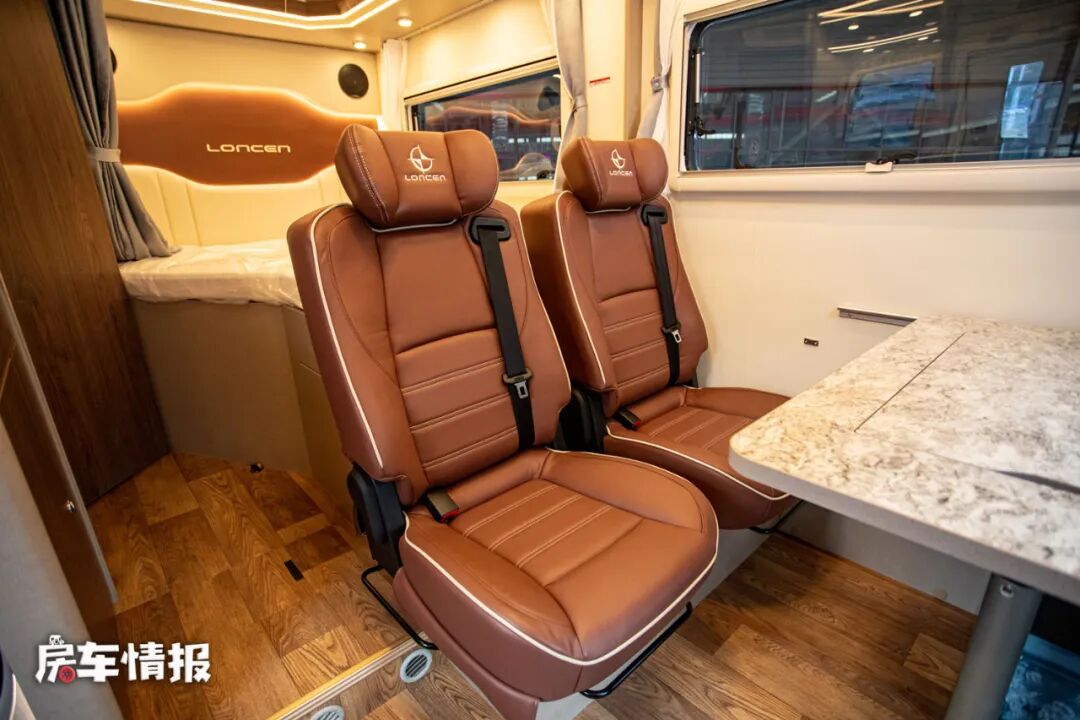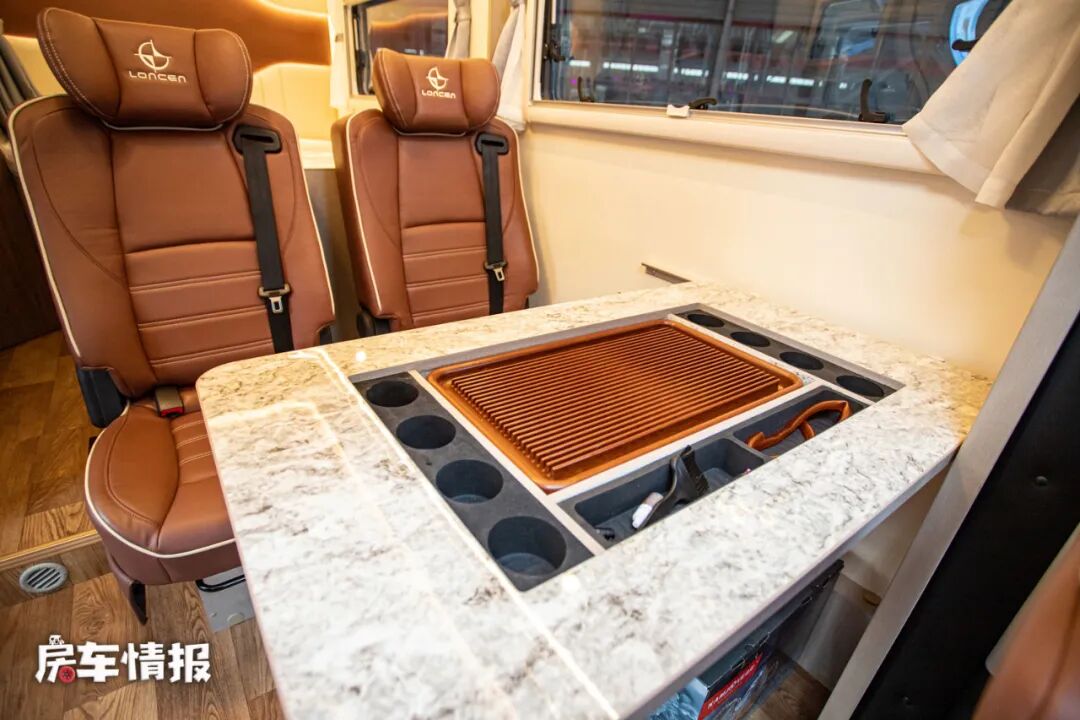 车内的布局也是采用了当下比较主流的布局,作为一款核载四人的房车,这款车的会客区采用的双人乘用车座椅+升降餐桌的设计,对于日常乘坐还是提供了不错的舒适度,而餐桌上还隐藏了一个小型的茶台,这也是朗宸房车一贯的“中式”设计,对于一些热爱茶道的朋友来说,还是很实用的配置。