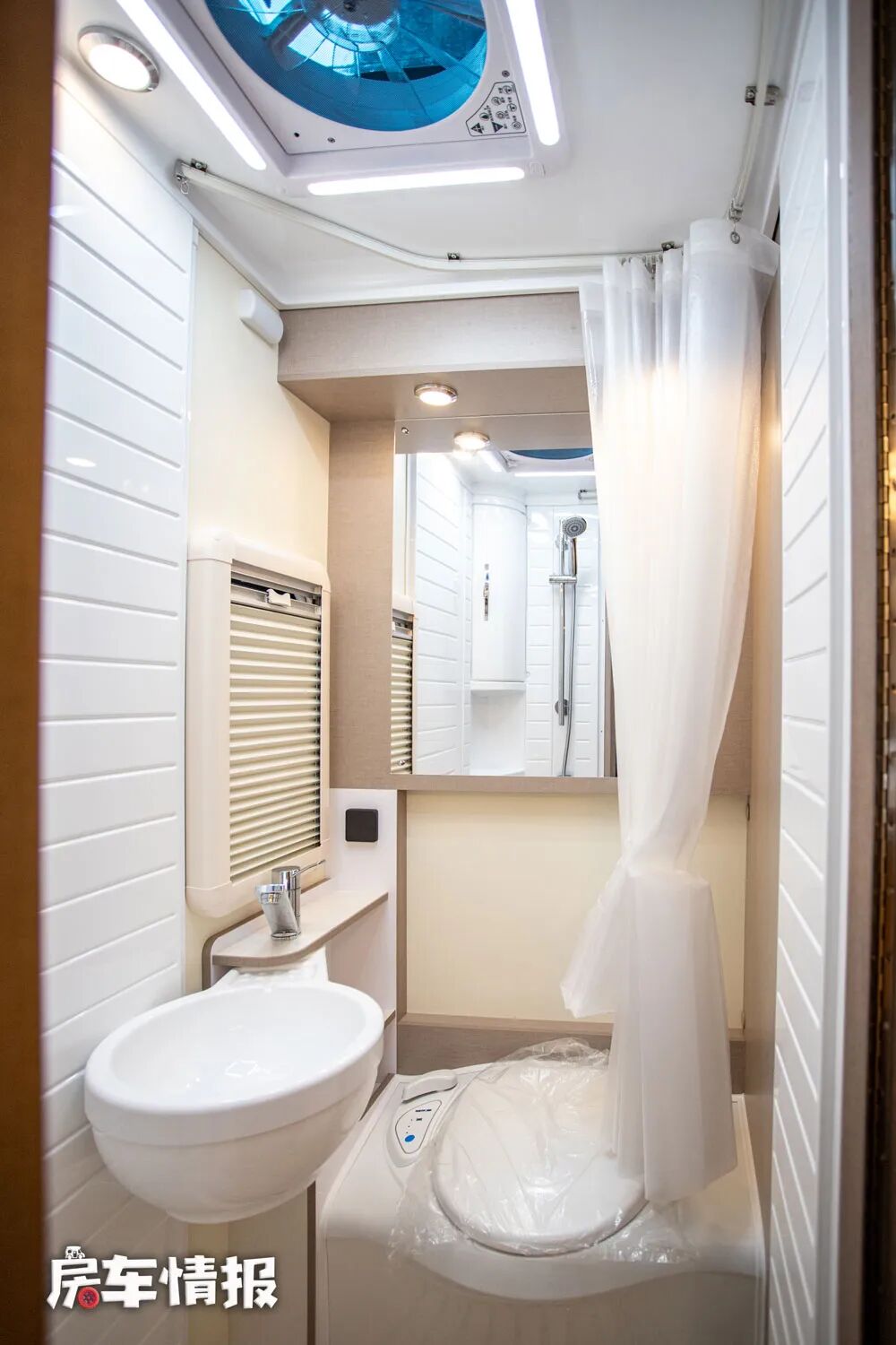 车内的卫浴室在同类型房车中算是比较大空间的了,而且内部使用了大量的能够防潮防霉的吸塑件,配有独立淋浴花洒、固定的马桶、可旋转的马桶、梳妆镜、换气扇等,另外值得一提的是,内部还有暖风出风口,这样即便在天气比较寒冷的时候,也能够正常的洗热水澡了。
