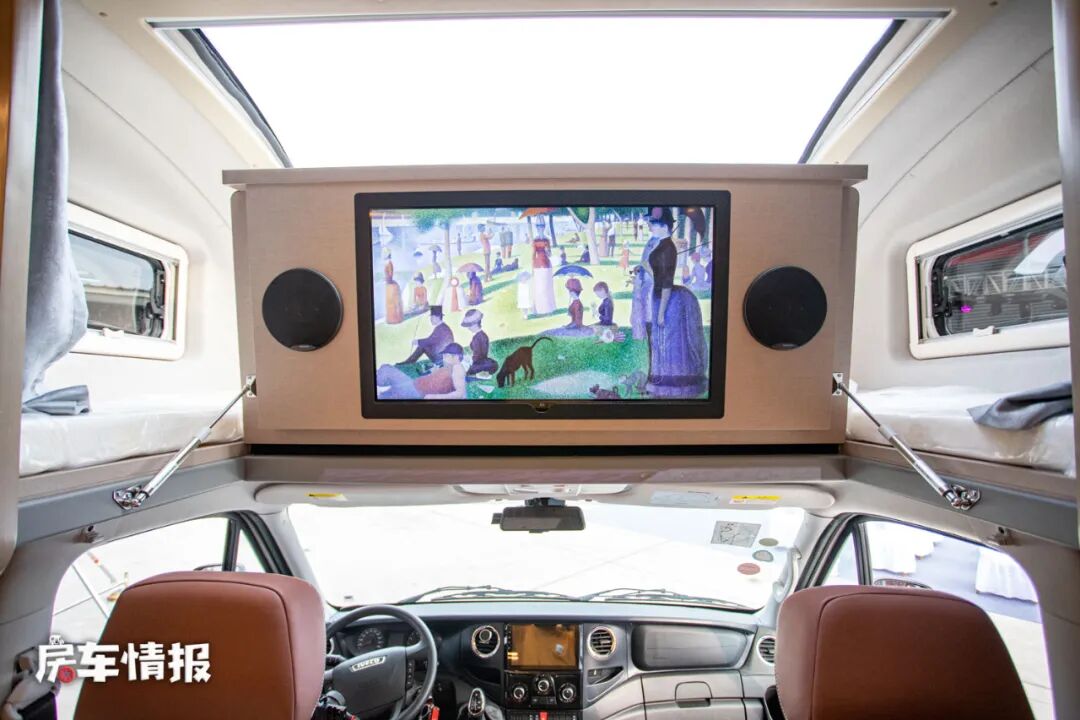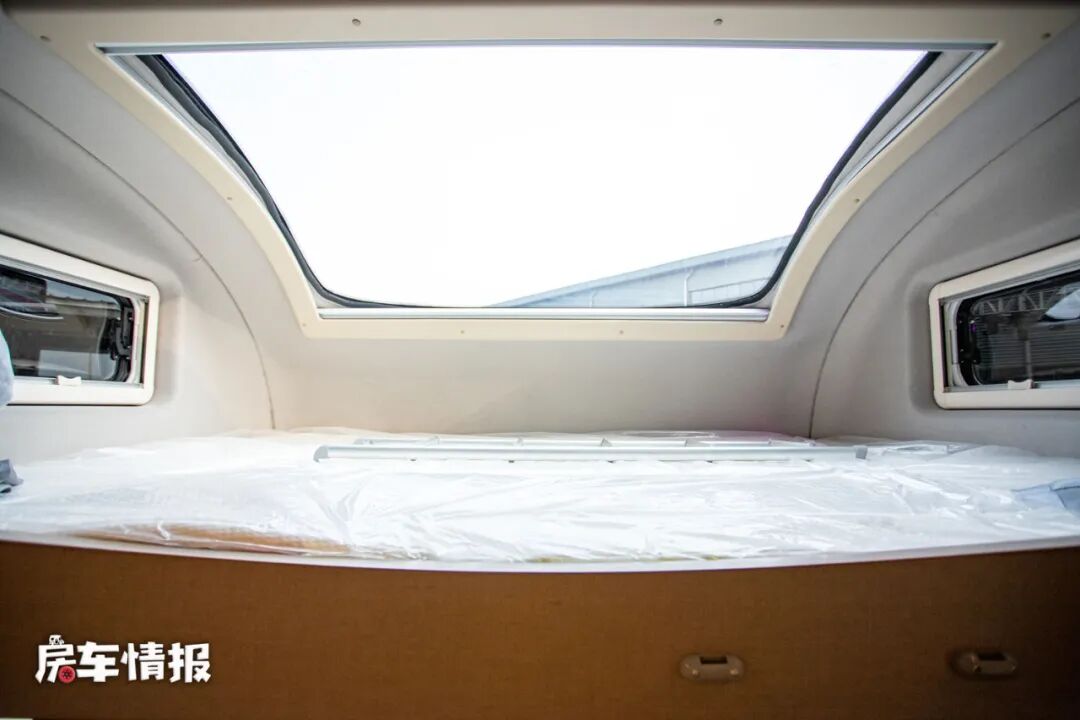 第二个位于额头区域内的休息区可以说是非常有亮点了,因为在这个床铺的正上方,有一扇超大尺寸的全景天窗,这个天窗的大小可以说在业界内都比较少见,另外这扇天窗是采用了双层汽车压胶玻璃,整体的采光和通透性都非常不错,还带有遮挡帘,无论白天晚上都可以放心的使用。