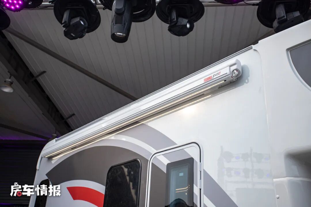 车身外部配置也不少,带有手动的遮阳棚、外置的抽拉燃气灶、水电接驳口以及一个超大尺寸的贯通式行李舱,这样一些旅行中所携带的行李的存放也能够轻松的满足。