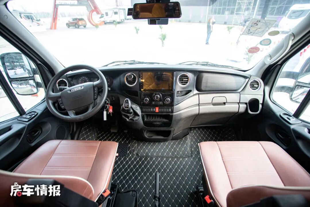 整辆车是搭载的依维柯欧胜底盘所打造的,不过和普通的C型房车相比,这款车显得有些“人高马大”,其整体尺寸分别为5995*2480*3350mm,超过3米多的车身高度在国内房车上并不多见,毕竟再过一些限高的时候多少还是会受到些影响,不过后期尽量可以加装上限高预警,以保证整辆车的安全。
