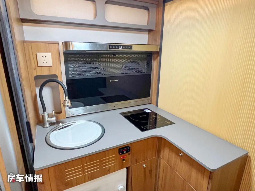 生活区的设计依然是延续了该品牌轻奢现代简约的内饰风格,使整辆车更倾向于年轻人的审美。布局上,因为全车是采用了中部上门的设计,所以厨房区域分散到车门一前一后两部分,最前方是厨房主操作台,台面上带有凸起的陶瓷水槽、电磁炉,下方则是一左一右共152L的冰箱。车内共提供了三个休息床位。目前这款车的官方报价是55.8万元,整体来看还是挺不错的。