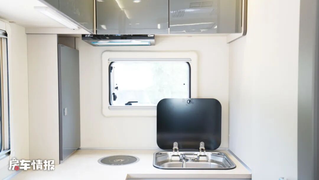 尾部的台面则提供了电磁炉和不锈钢洗菜池,上方还配备了抽油烟机,用来缓解在车内大火猛炒带来的油烟问题。