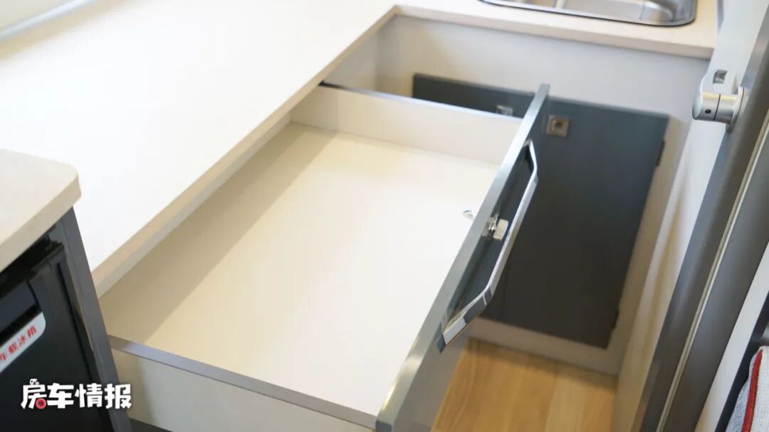 还有一个亮点就是洗手池下部的超大储物柜,从厨房、车身外尾部左右两侧的舱门均可拿取物品,左右贯通,容积达到了660L 旅行生活所需物品,统统都可以放在这里。