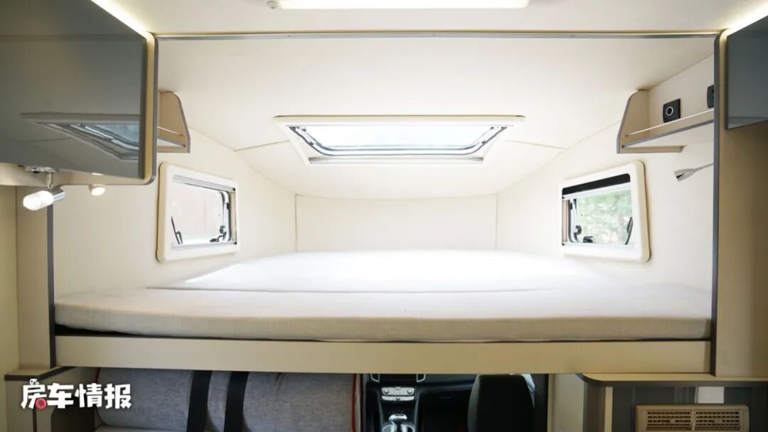 除去这张沙发床之外,在前部驾驶室上方的额头区域内,还提供了双人额头床,尺寸为1950mm*1700mm,两个成年人睡觉空间绝对非常富裕。