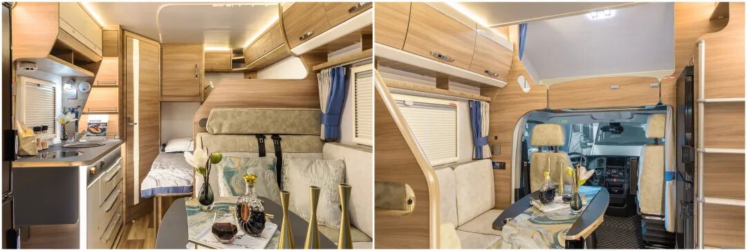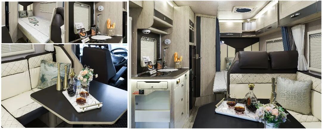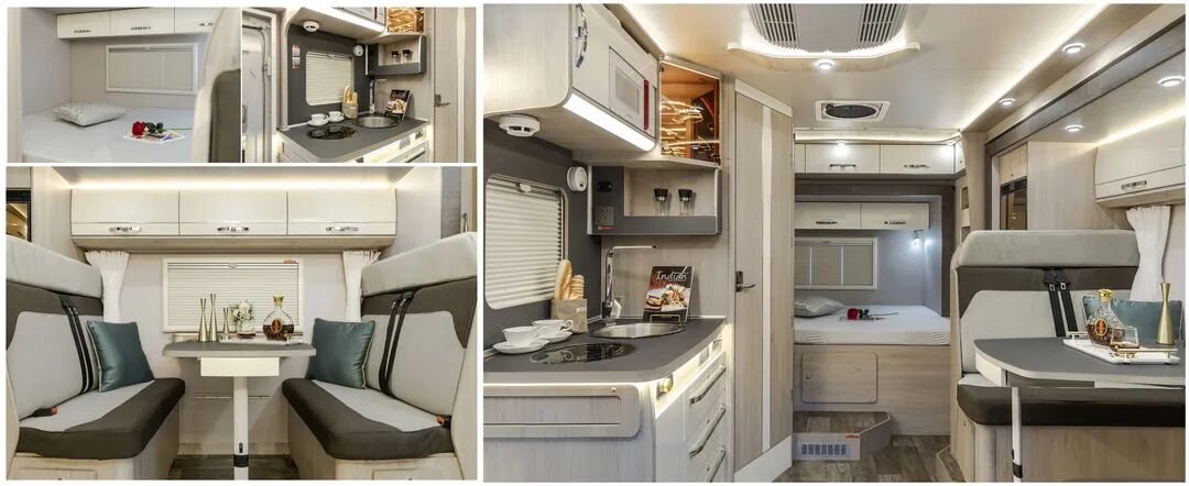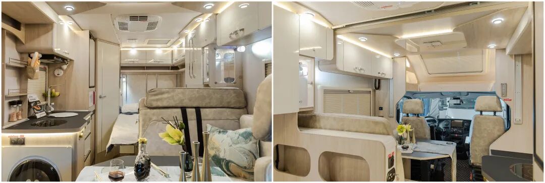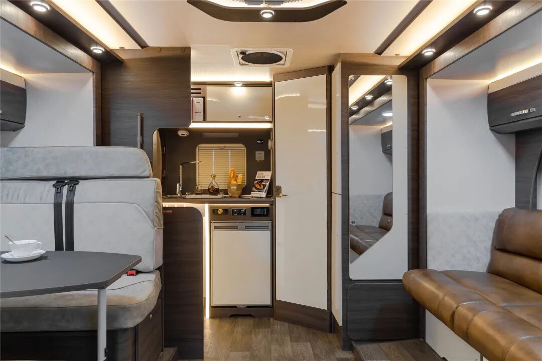 北欧轻奢风格内饰,家具颜色以浅色系为主色调,进行了深浅撞色设计,搭配氛围灯,能够带给驾乘者清爽舒心的感受。布局采用“驾驶室+会客区+厨房区+卫生间+休息区”的传统布局。四周设有大量储物空间,零碎的小物件们也有了“容身之所”。