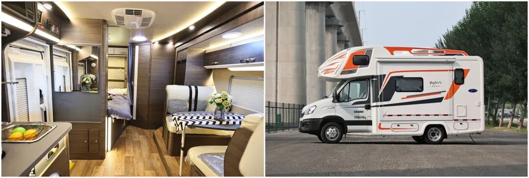 基于依维柯欧胜底盘打造的T型房车,搭载3.0T涡轮增压柴油发动机,8速全自动变速箱,最大功率为125kW,满足国六排放标准,蓝牌C照即可驾驶。外观设计上,白色车身,搭配灰色和亮橘色相间的彩条。整个车厢采用了三明治复合车身结构,低重心设计,轻量化板材。