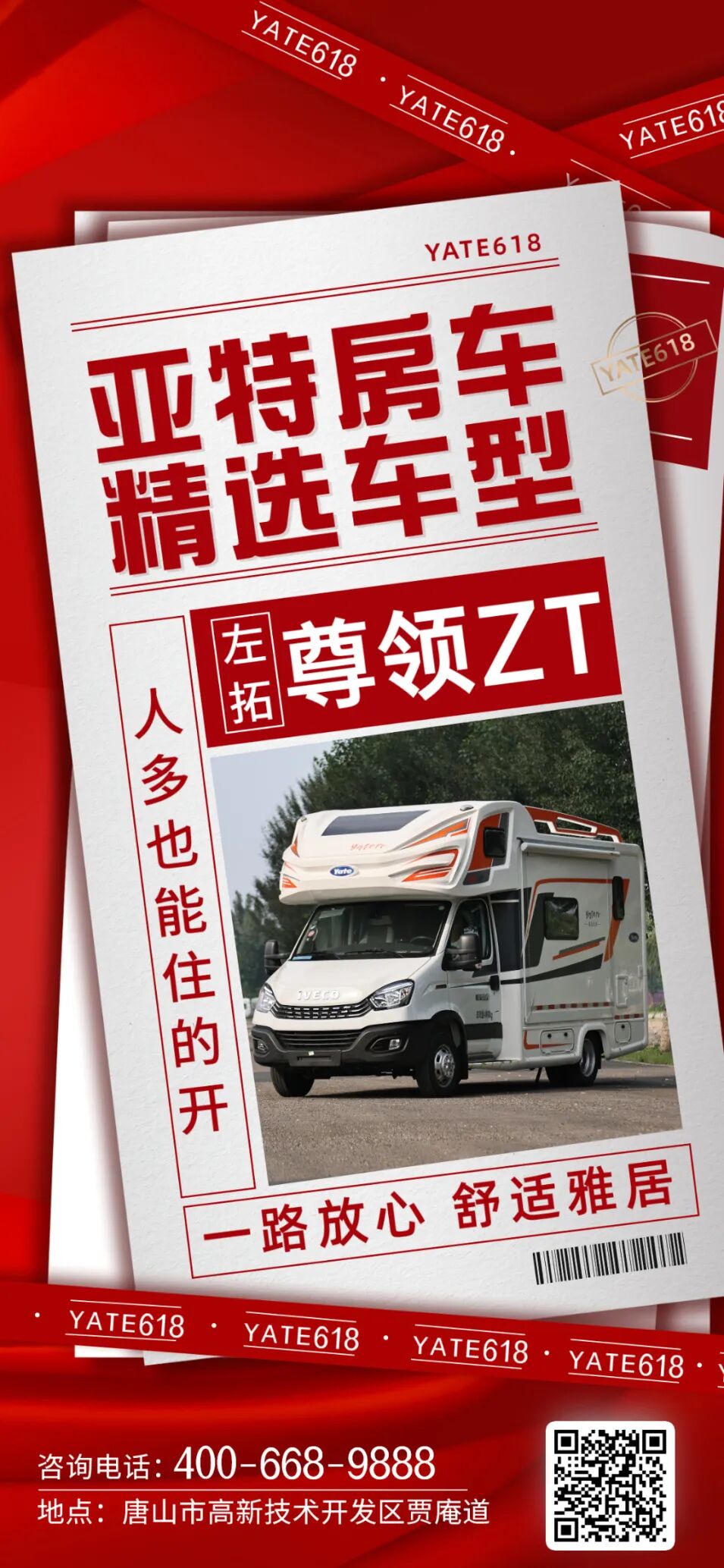 单拓展纵置床格局的尊领ZT,依维柯欧胜底盘,整车采用三明治复合车身结构,保温、耐火。低重心设计保证了整车行使的安全。车内布局采用额头双人床、对卡座、厨房区、卫生间和纵置床。车内电器配备了进口142L车载专用冰箱,壁挂式洗衣机,900W电磁炉、微波炉和电视。电路系统方面,3000W充电逆变一体机、820AH磷酸铁锂电池、如果新能源500W单晶硅太阳能硬板。、房车专用ABL外接电源充电口(配10米电源线)等。水路方面,净水箱180升、灰水箱50升、外接注水口和外部取水口。