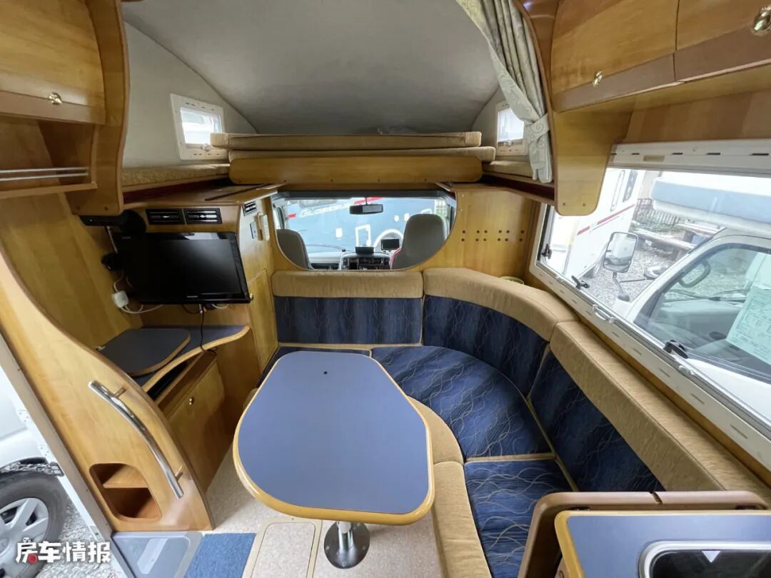 驾驶室后方为全车的会客区域,采用了圆弧形沙发+升降餐桌的设计,看起来特别有豪华的感觉,副驾驶座椅后方还带有一台电视机,可以为日常提供基础的娱乐项目,下方的鞋柜也是日本房车中常见的一个实用设计。