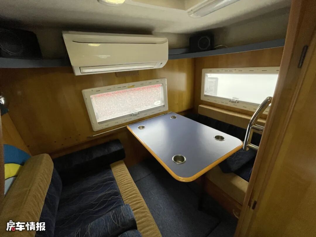 最后就是位于车厢尾部的第二个会客区,白天的时候是以卡座沙发+餐桌的样式呈现的,顶部还带有一台家用变频空调,到了晚上的时候,则可以拼接成一张双人的床铺,这样结合前方的额头床,整辆车可以容纳四个人睡觉休息。