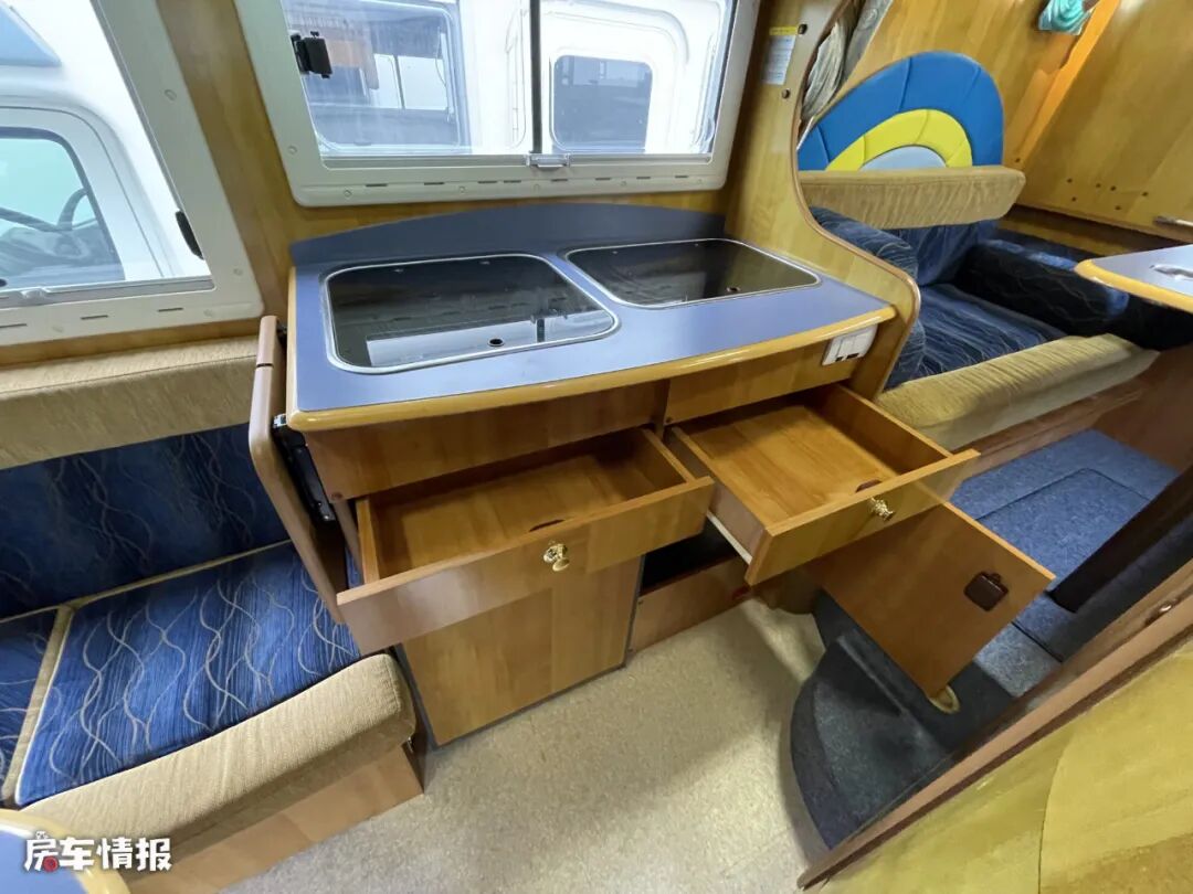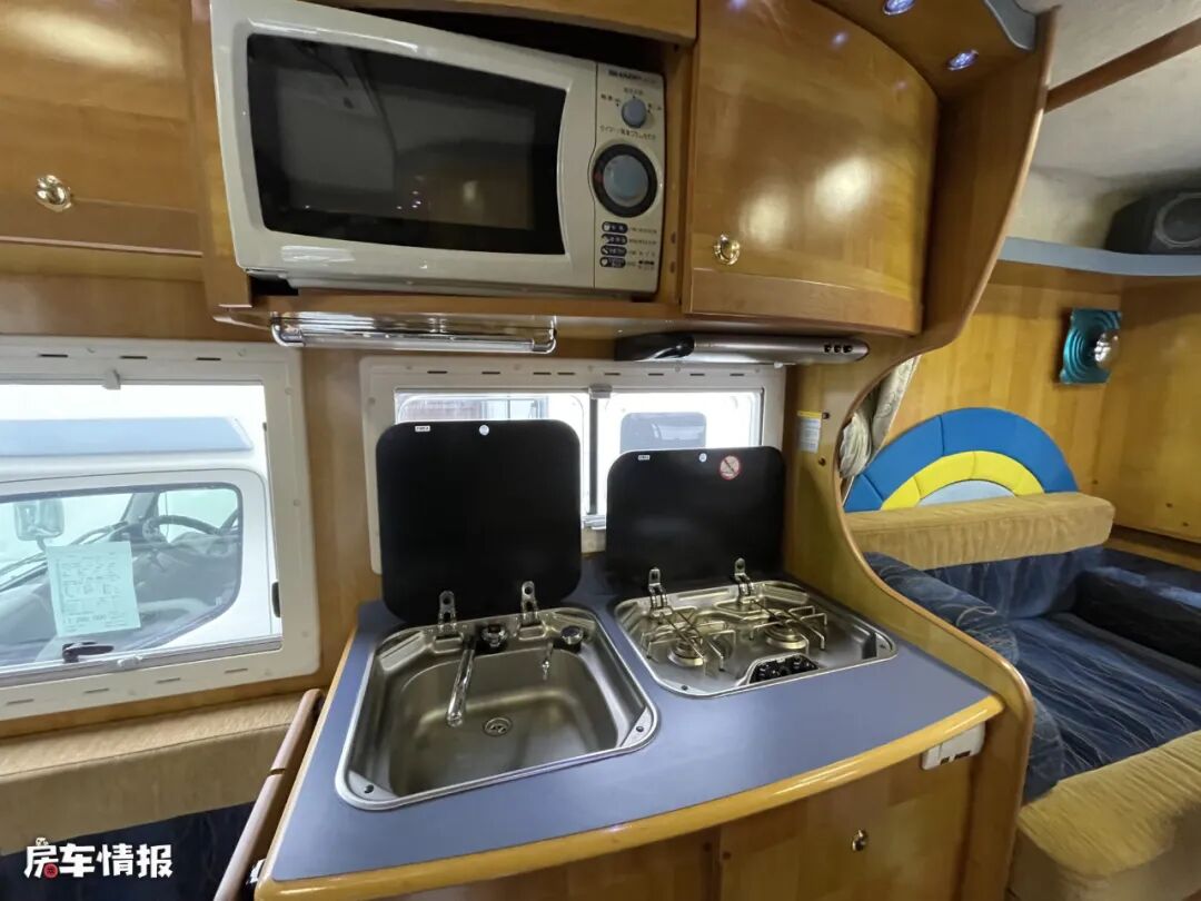 和我们平时所介绍的靠近乘客门处的厨房操作台设计的不同,这款车的厨房区域位于内侧,也就是会客区沙发的后方,台面上提供了翻盖的不锈钢水槽和双孔燃气灶,顶部带有微波炉,下方带有储物空间和车载冰箱,能够满足日常的基础需求。