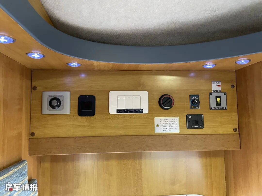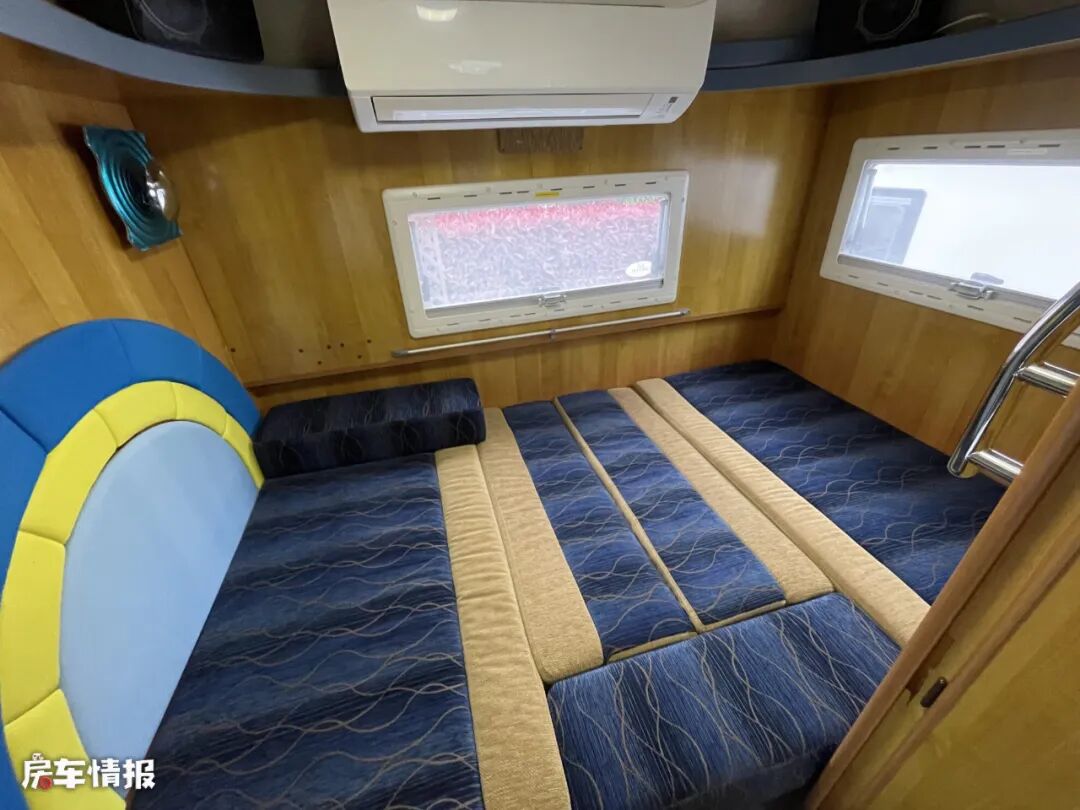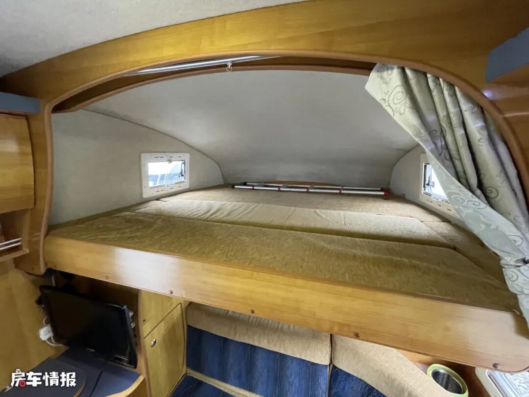 全车采用的是中上门的设计,最前方的驾驶室顶部是设计了一张抽拉式的额头床,由于弧形造型的设计,额头区的内高表现的不太理想,不过由于是抽拉式的设计,所以可以向外拓展出不少长度,也缓解了整体的压抑感,同时两侧还带有基础的采光窗户。