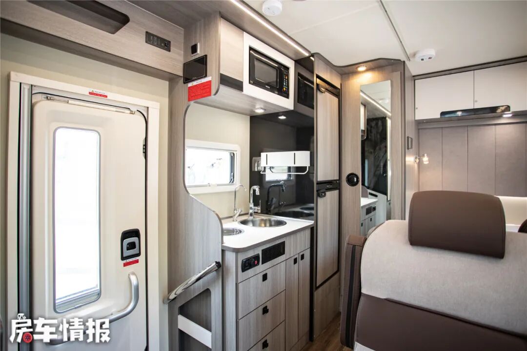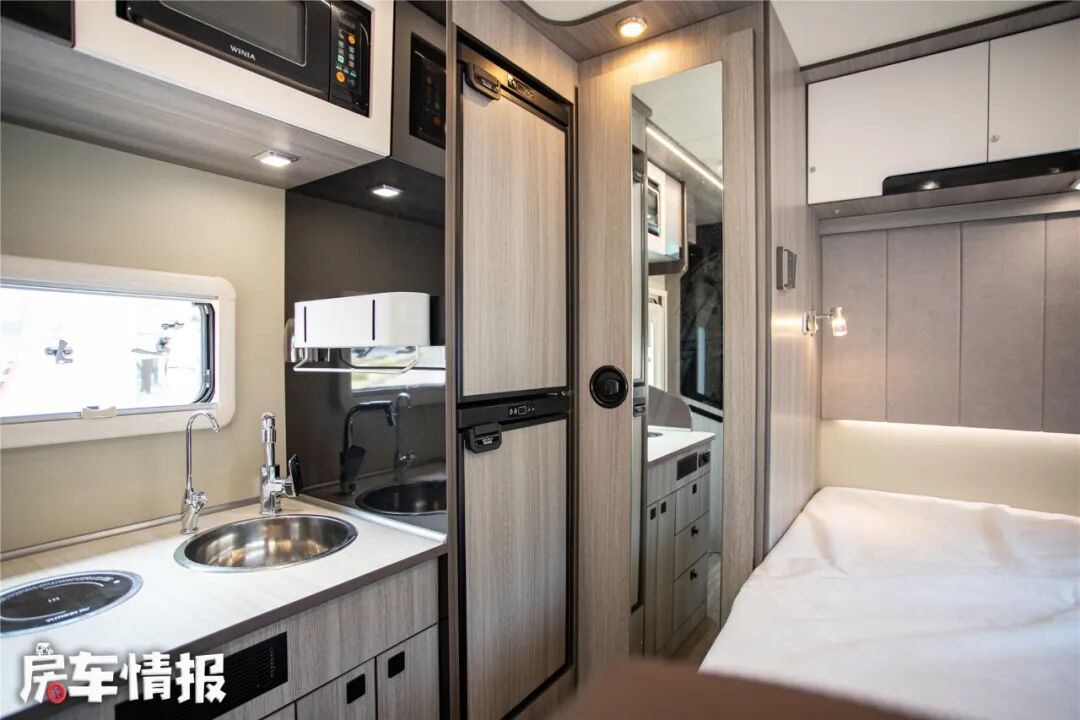 除此厨房区域还提供了微波炉、152L房车专用冰箱,需要注意的是这款车标配是85L房车专用冰箱。