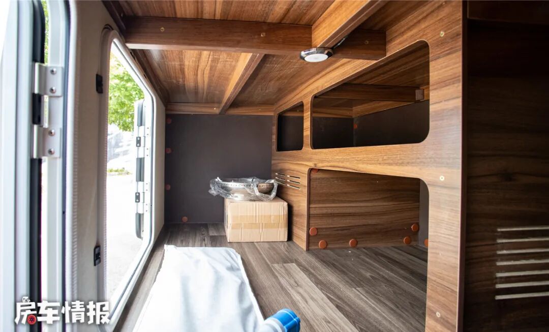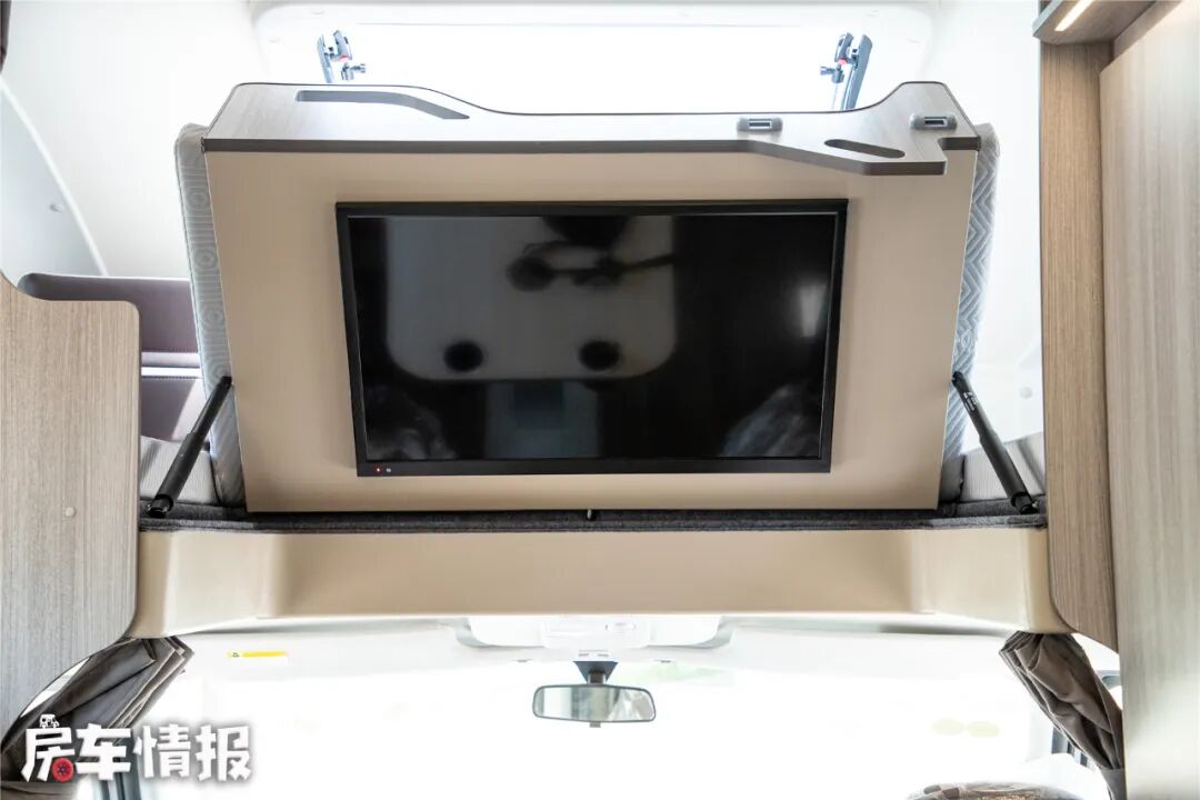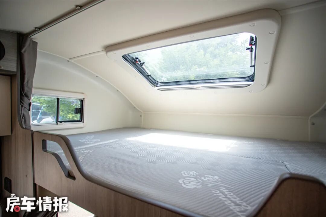 位于驾驶室顶部,是一张尺寸达到了2米2*1米4的超大额头床,可以轻松睡下两名成年人,再加上顶部的超大天窗(需选装)以及两侧的小侧窗,让这里的通透性也很不错,日常休息不会感到压抑,床板下方可选装一台32寸互联网液晶电视,方便坐在沙发上观看。