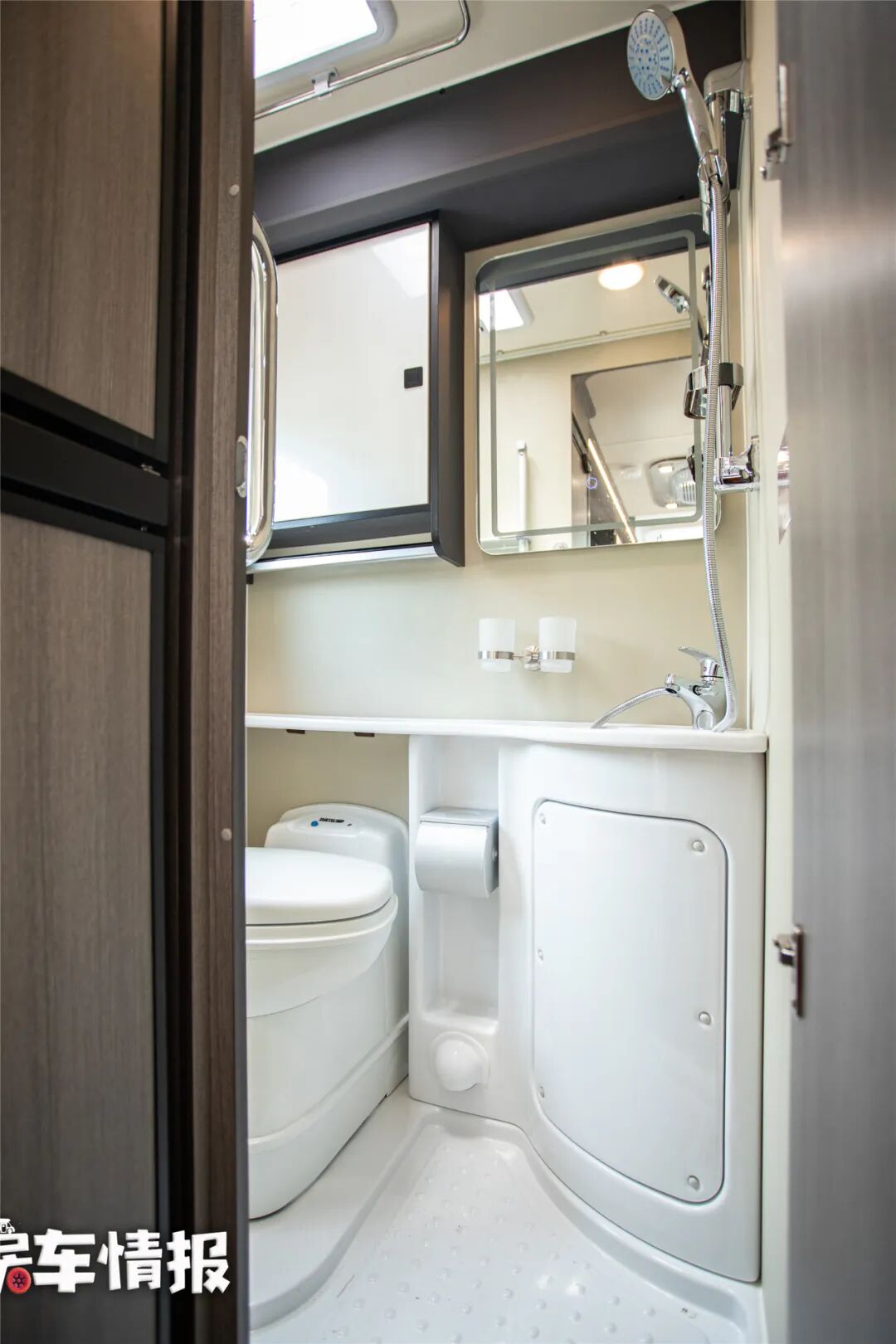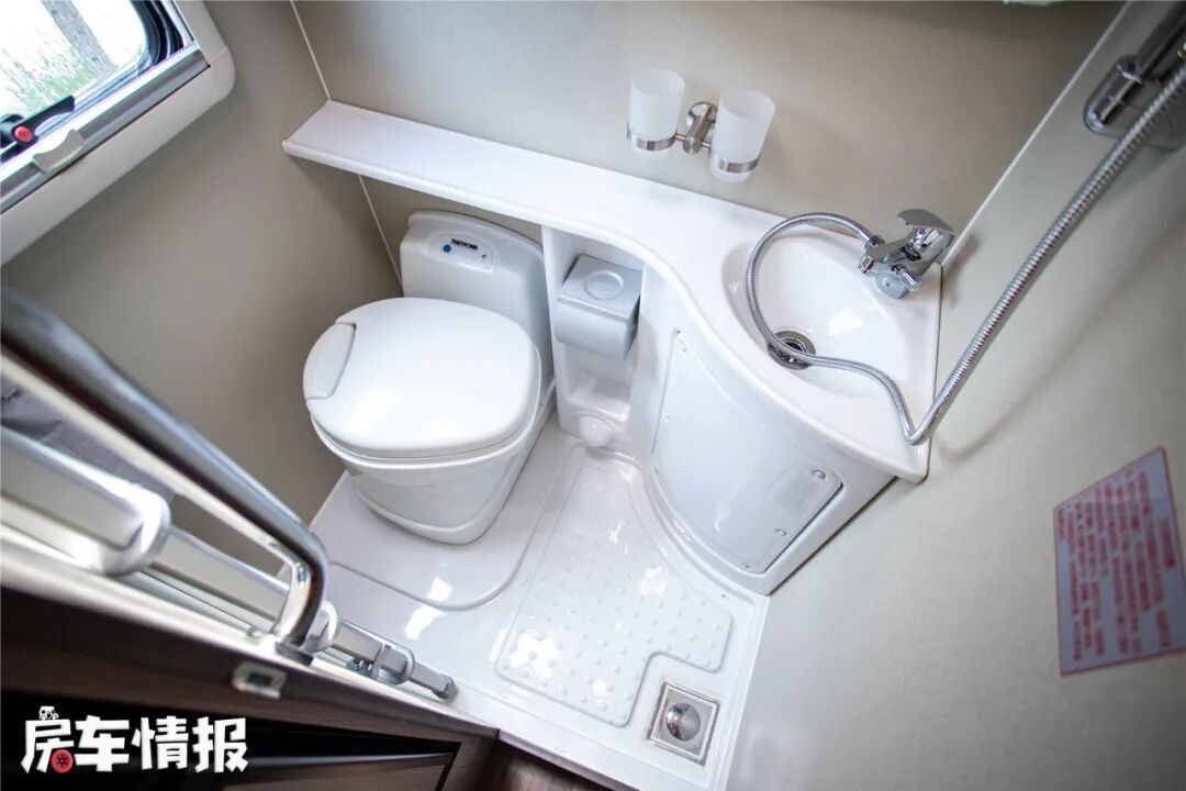车内卫生间的整体空间也挺大,横向布置的空间可以轻松满足成年人在内部淋雨、如厕,带有盒式马桶、换气扇、独立淋雨、梳妆镜等常用设备,另外这款车还提供了10千瓦独立燃油加热器,就算是到了海拔3500米以上也能够有暖风热水使用,这对于喜欢到高海拔地区玩的朋友来说挺方便,搭配这款车的130L+90L双净水箱和60L灰水,可以满足日常洗漱问题。