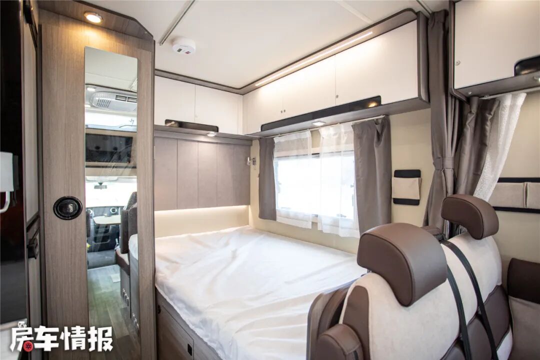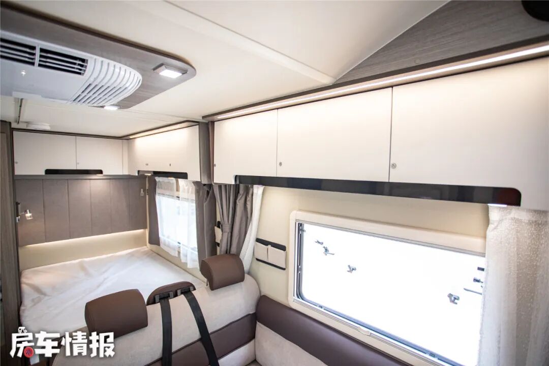 位于车厢尾部还提供了一张独立纵置双人床,尺寸约为1米9*1米15,睡下两个体型偏瘦或一大一小比较合适,顶部的储物吊柜采用比较方正的造型,内部空间比较规整,可以放下不少随身物品,另外吊柜全部采用按压式锁止。