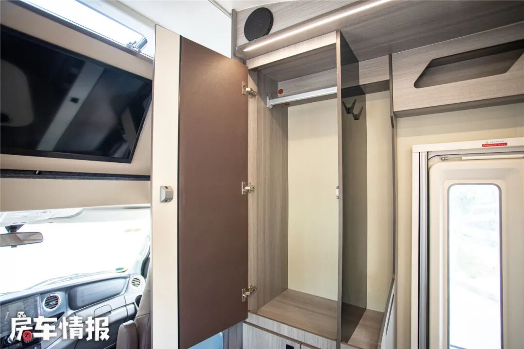 靠近中门一侧,提供了一组储物柜,内部空间挺大,可以把易褶皱的衣物放在里边,位于外侧还提供了衣帽钩和开放式储物格,便于在上下车的时候挂衣服或放钥匙、手包等小件物品。