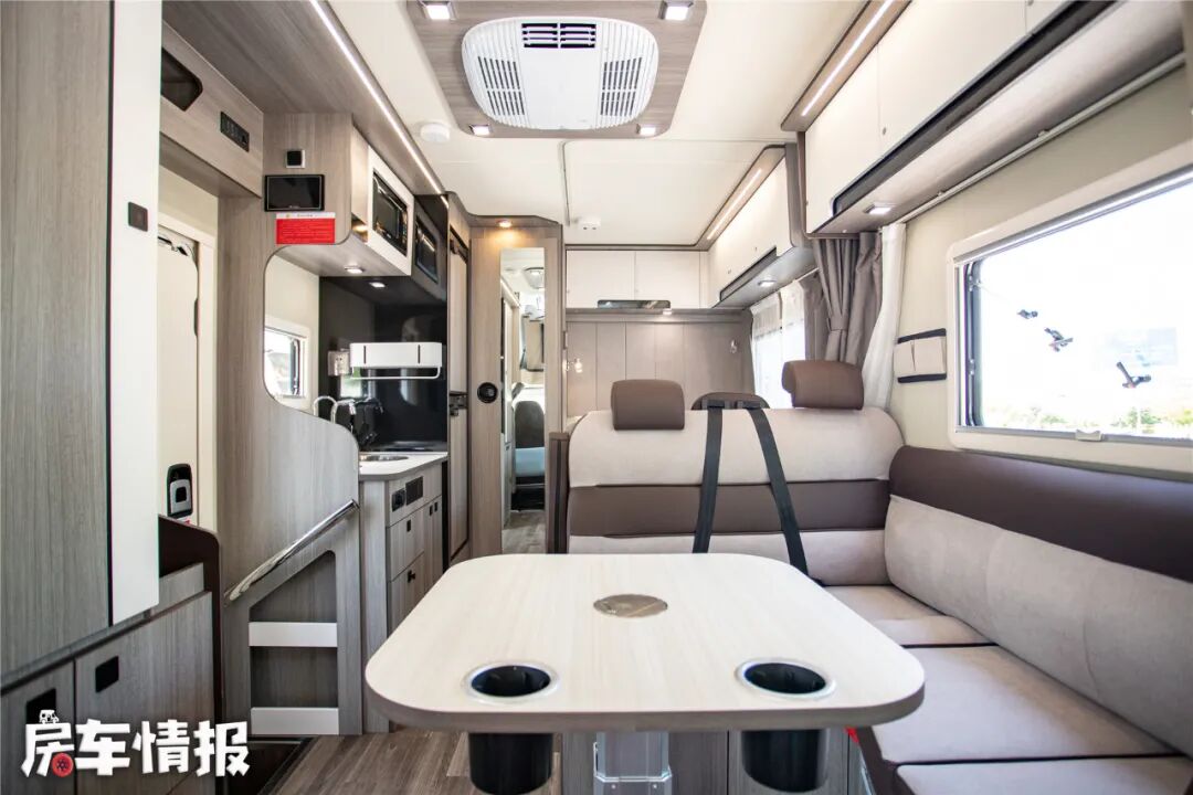 生活区采用了一个比较常规的布局方式,前方是L型沙发休息区,后方是厨房和卫生间以及主休息区,素雅的配色以及精致的做工可以满足一家四口人使用,另外整车在室内环保上也格外用心,由国家认证的“金鼻子”团队进行检验,不用担心新车内部空气问题。