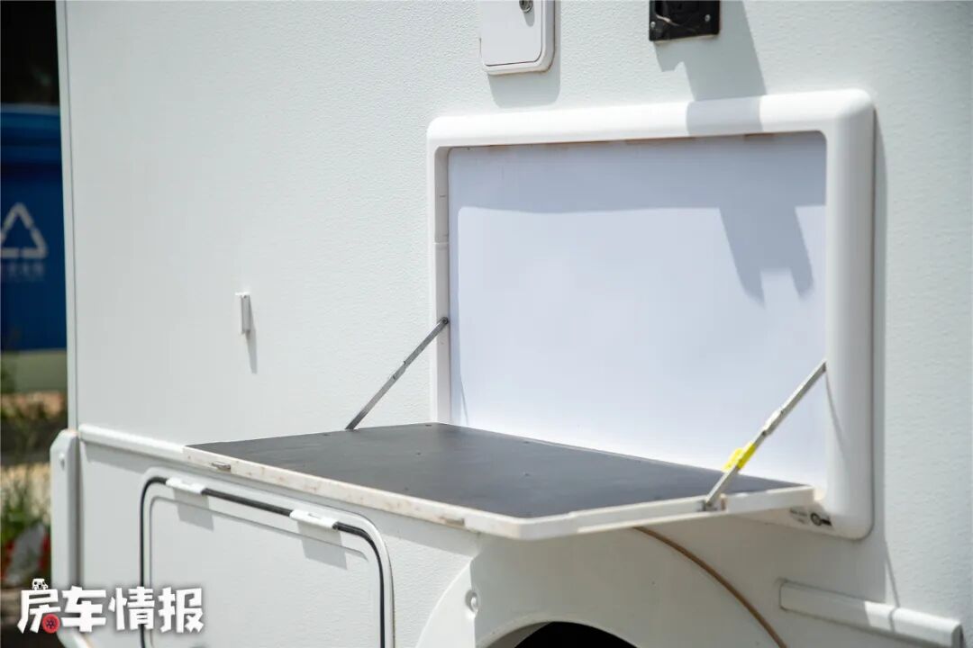 车身外部提供了比较丰富的外部设备,如手动遮阳棚、储物箱、置物台、外置电源输出口、标配便携式炉灶(可选燃气灶或燃油灶)等,保证了日常使用的便利性。