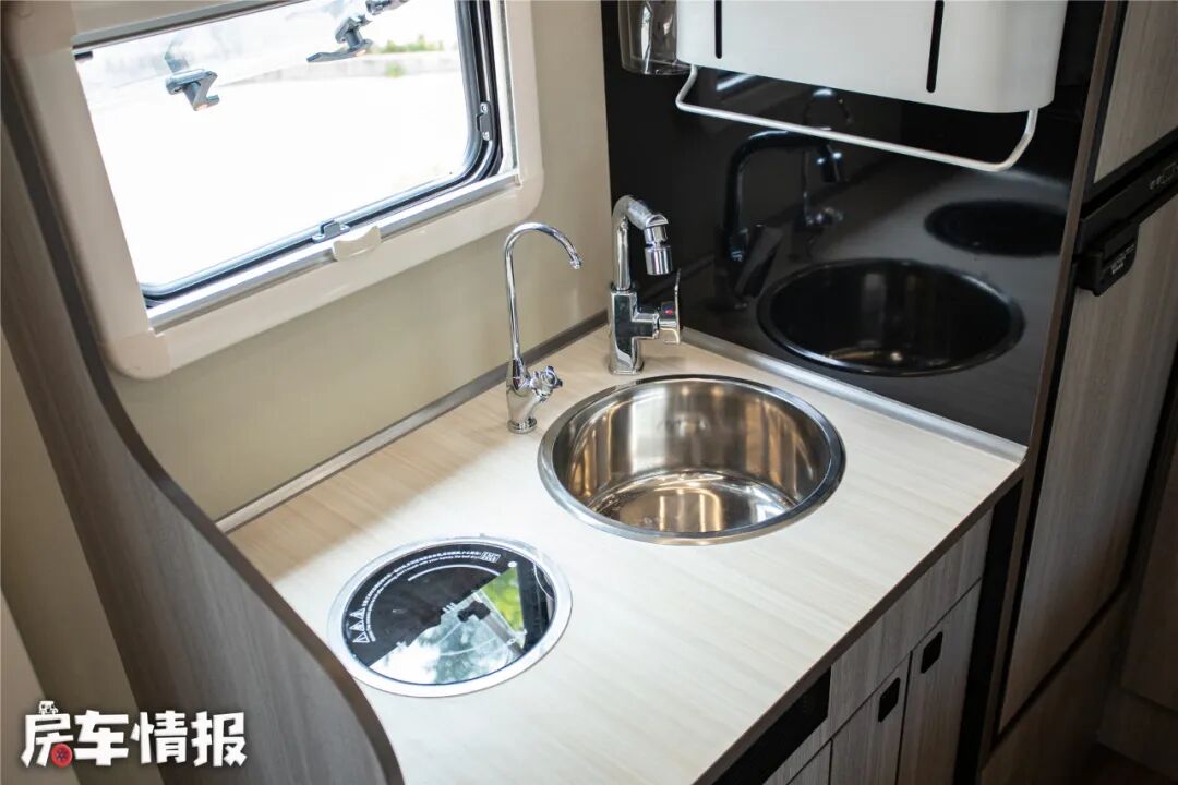 车内厨房区域位于中门后方,整体设计比较规整,厨房台面上提供了电磁炉和洗菜池,以及一个独立直饮水龙头,平时直饮水箱就放在下方的储物柜内,更换拿取都挺方便。