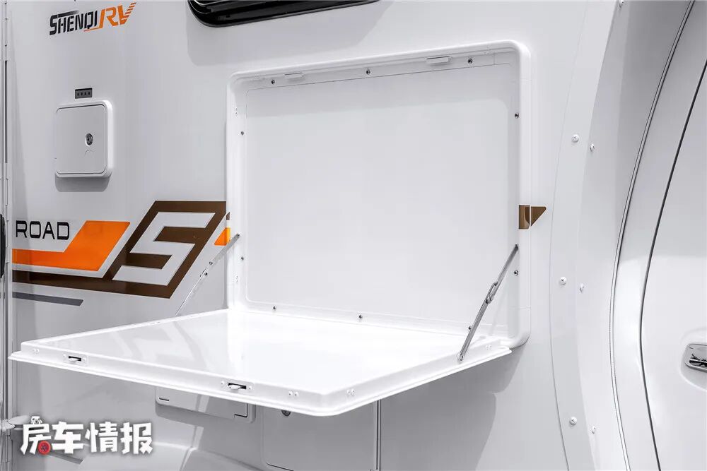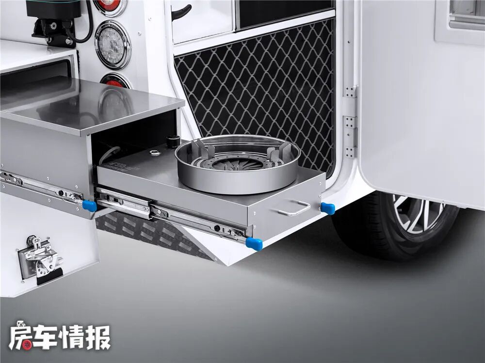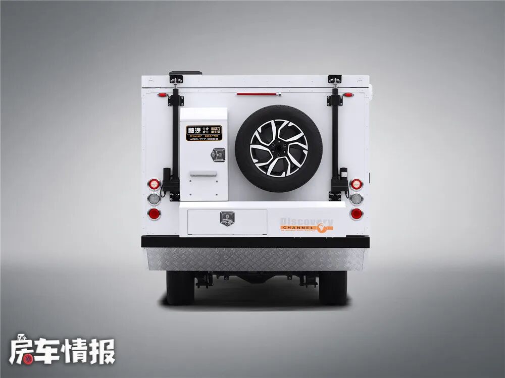 车身外部也加入了不少实用的设备,外部置物翻板、手动遮阳棚等一应俱全,位于车尾部还加入了外挂式储物箱和备胎,而位于下方的储物箱内则隐藏着一部抽拉柴油灶,这个小设计还挺别致。