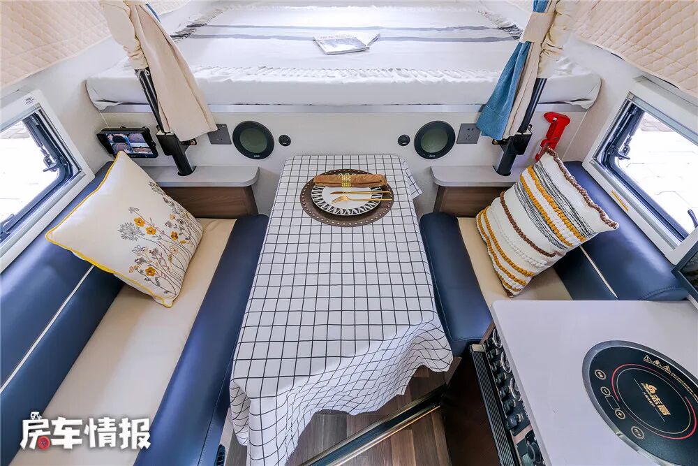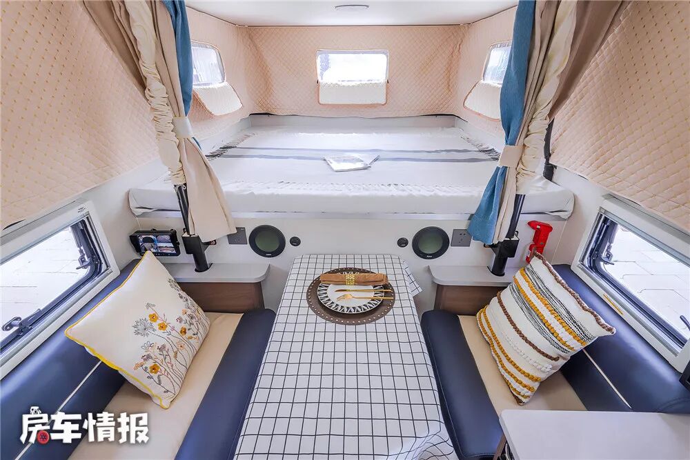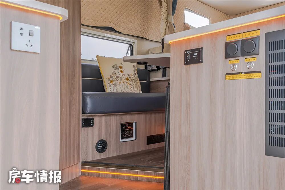 作为一款升顶房车,车厢内部的保温隔热能力也是车主所关心的,这款车升顶部分采用2000Pa防雨面料和高保温材料来增强升顶部分的防水性和保温性。当然啦,实际效果如何?还要等新车上市后,实际测试才能得到答案。