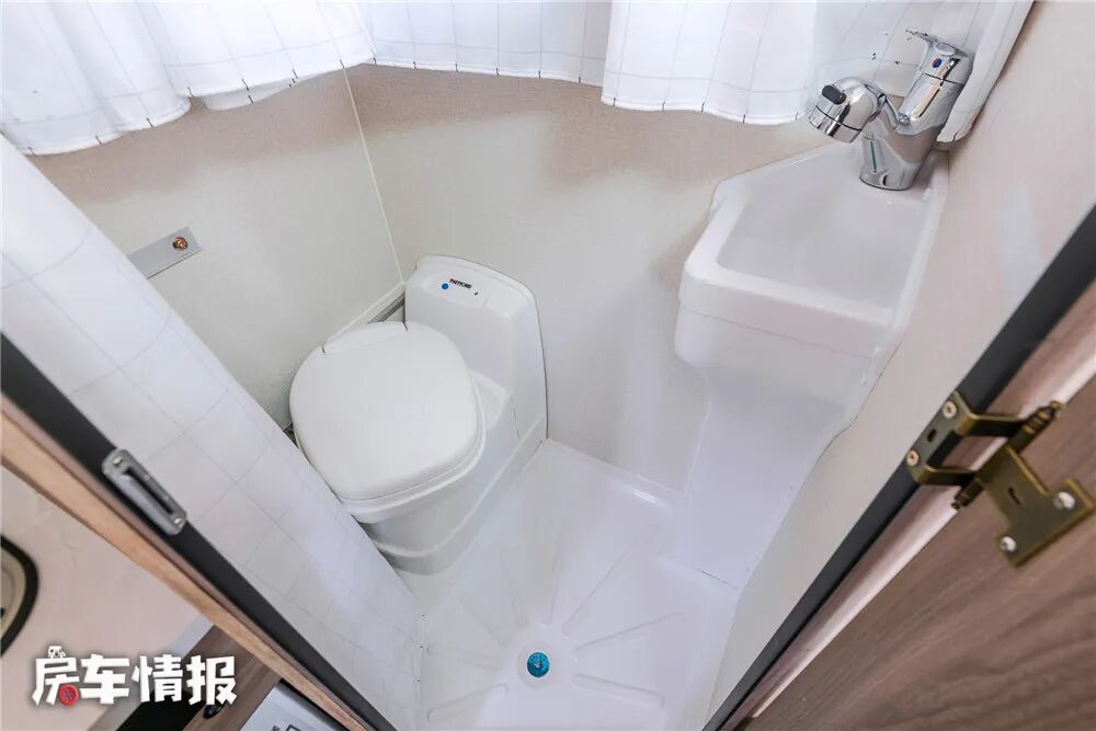 车内卫生间不出所料地采用了半固定+软帘的组合方式,这也是大多数升顶房车所头疼的问题,好在内部空间还挺不错,提供了盒式马桶、洗手池、换气扇等基础设备。