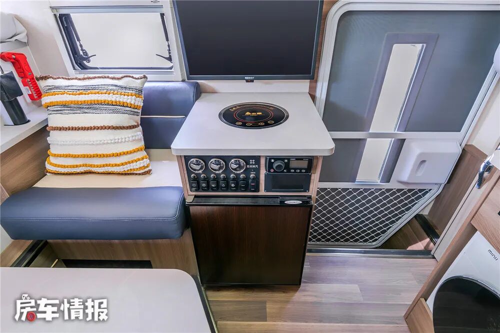 位于单人沙发旁还提供了一个简易厨房操作台,尺寸不是很大,但功能挺多,上方有一台24寸液晶电视,台面上则是一台1200W电磁炉,下方就是车内的电器控制面板、水箱水位显示表以及50L房车冰箱。