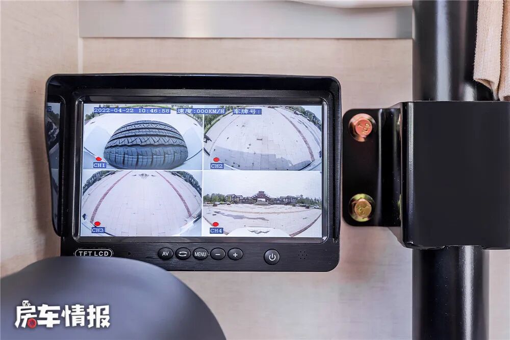水电上,这款车提供的也比较齐全,带有2000W逆变器、400AH锂电池、200W太阳能,和100L净水箱、45L灰水箱、17L黑水箱。除此以外还提供了12V空调、15L电热水器、3KG洗衣机、5000W柴油加热暖风、四路监控等生活设备。