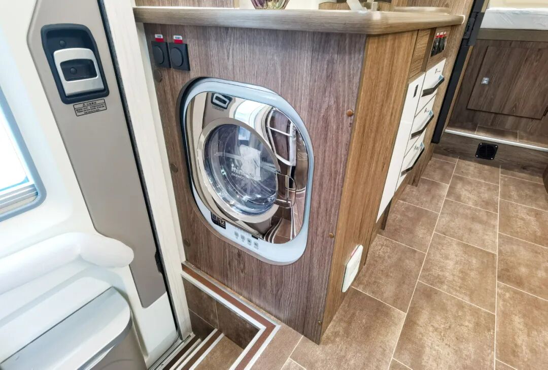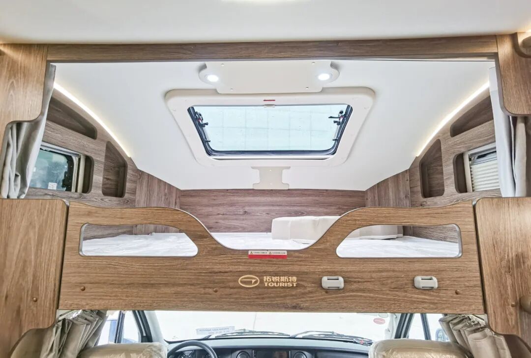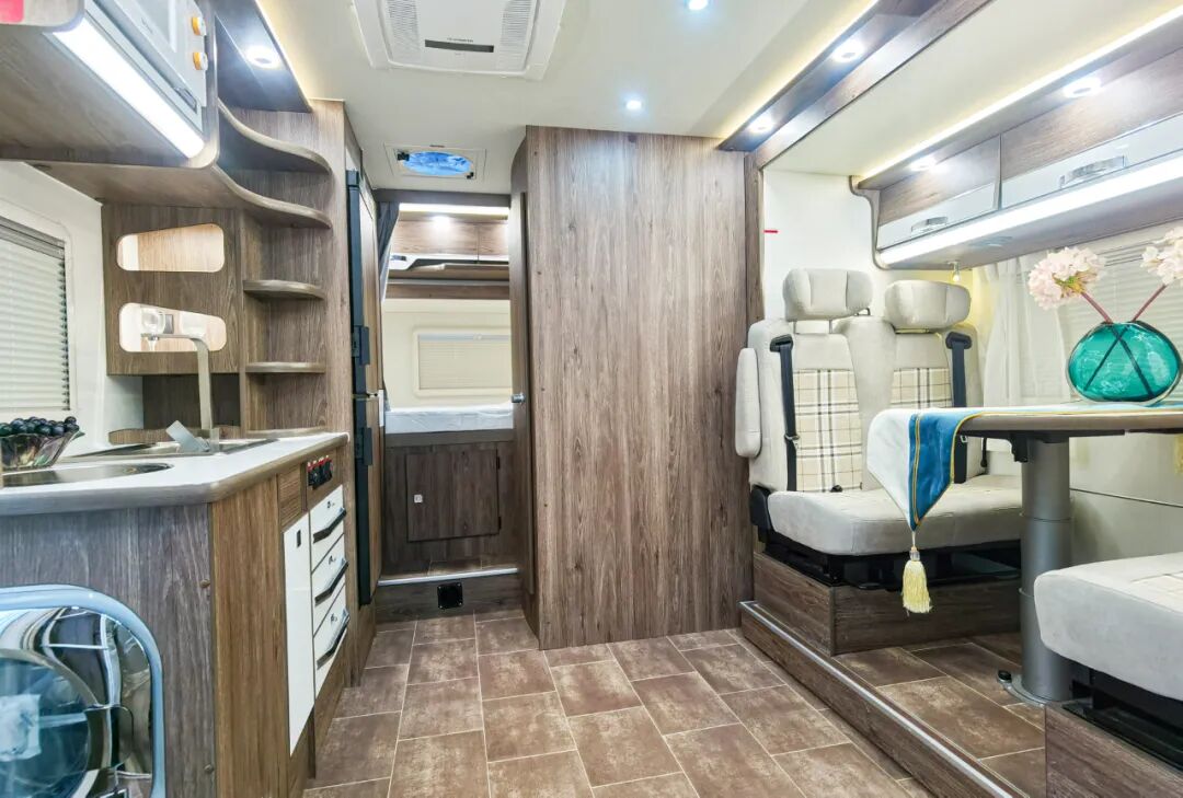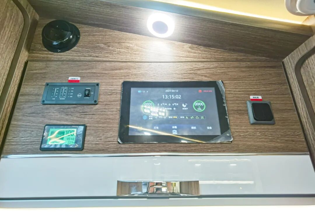 进入车厢内部,得益于车身左侧和尾部的两个拓展舱,生活区的空间还是非常宽阔的,高端的配色和原木纹家具搭配在一起,既温馨又精致。布局方面,前额头床+中部会客区+厨房+后置横床+卫生间。车内配备了负离子空气进化系统(智能新风系统),可过滤掉98%三微米以上粒子,尤其是当前对用户也是比较有效的配置之一。