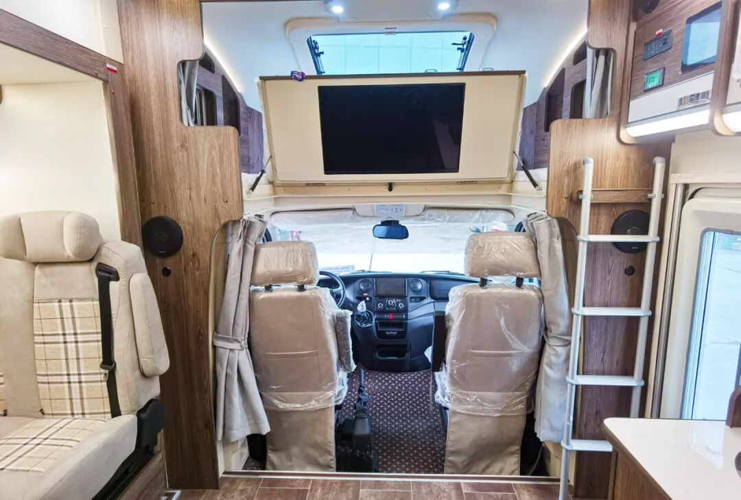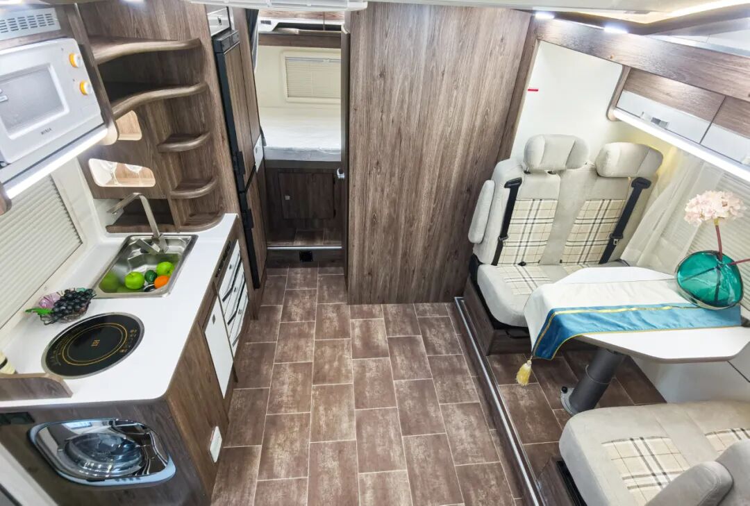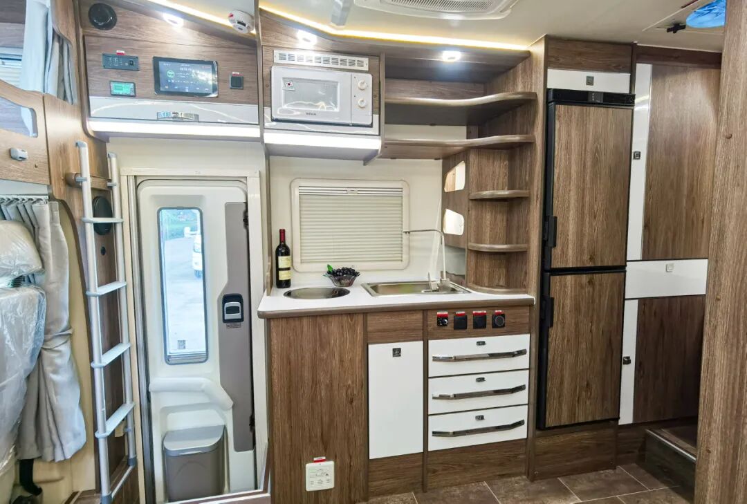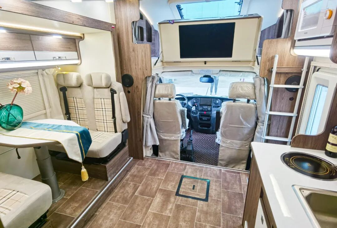 进入车厢内部,得益于车身左侧和尾部的两个拓展舱,生活区的空间还是非常宽阔的,高端的配色和原木纹家具搭配在一起,既温馨又精致。布局方面,前额头床+中部会客区+厨房+后置横床+卫生间。车内配备了负离子空气进化系统(智能新风系统),可过滤掉98%三微米以上粒子,尤其是当前对用户也是比较有效的配置之一。