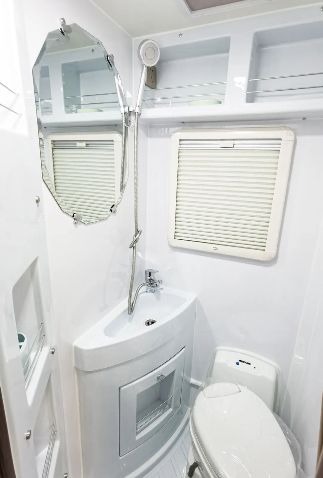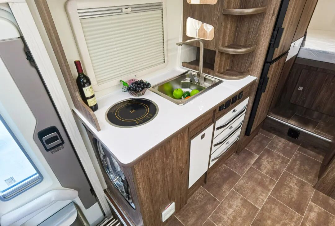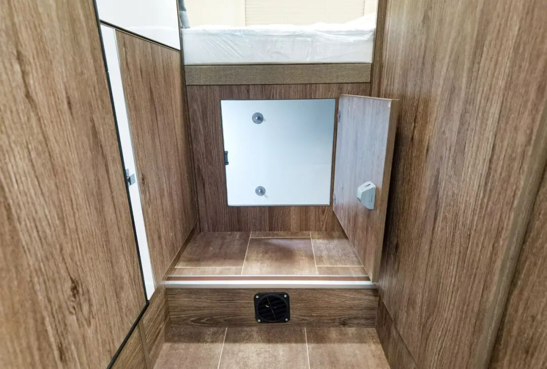 豪华卫浴间,洗手池,淋浴喷头,马桶,梳妆镜应有尽有,清水箱230 升+70L,灰水箱70 升。完全满足日常生活需要。全系都标配ABS一体成型工艺卫生间一直是拓锐斯特房车坚持的初衷。一体成型卫生间的优势简单而直观,直接杜绝了漏水,发霉的现象,造型漂亮。对于企业来说,这种卫生间开模成本偏高,一套磨具打造完成,适用于所有C型房车。