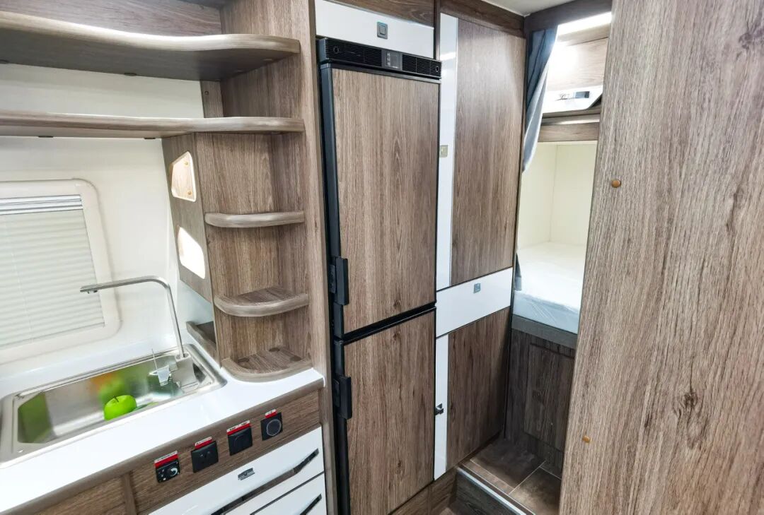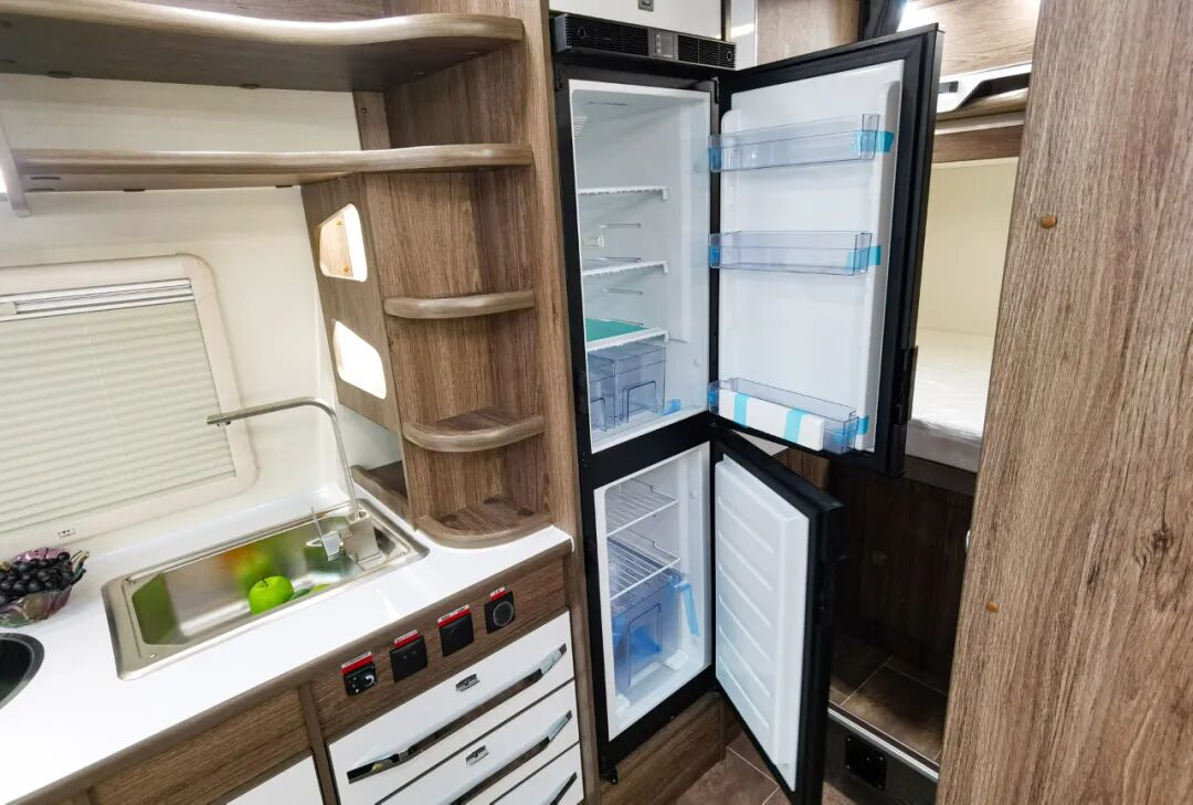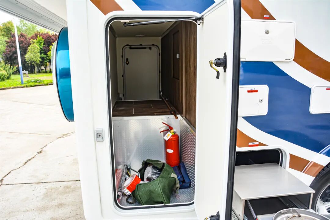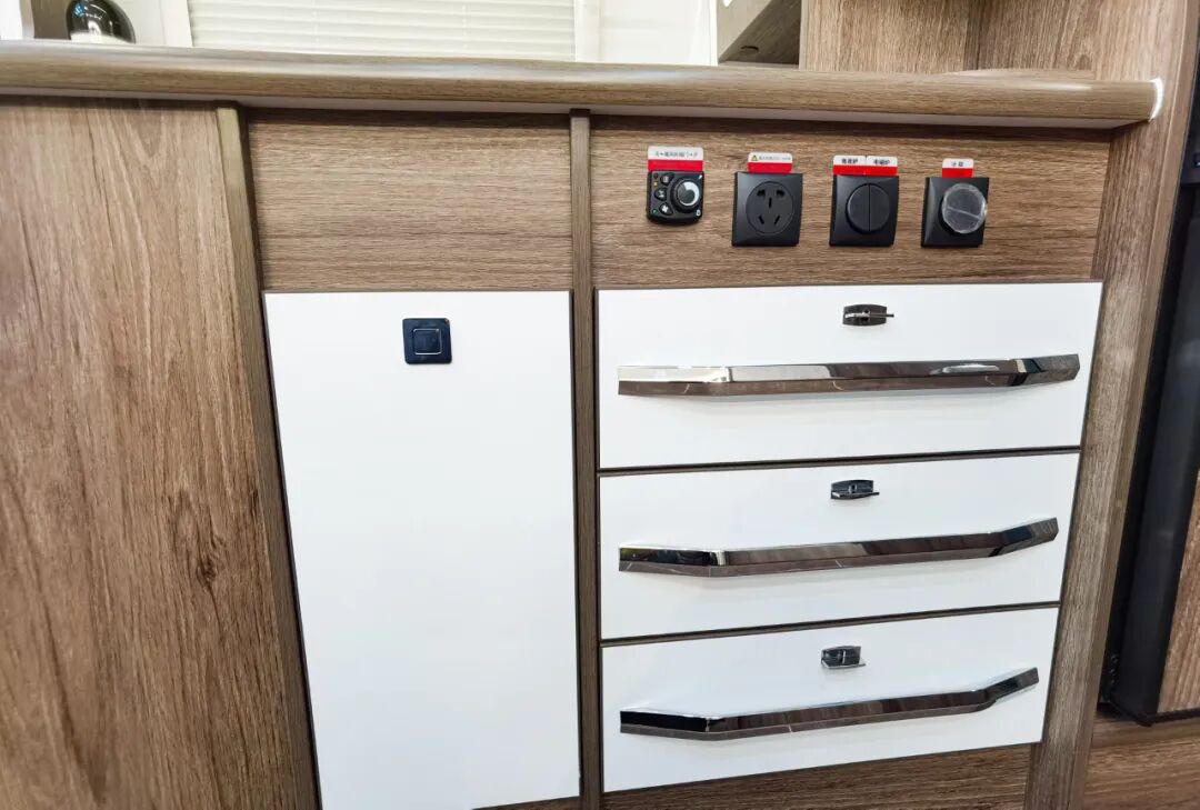 标配赛特福德142升车载大冰箱,上面保鲜,下面冷藏。满足吃货的味蕾。冰箱后方是大型衣柜,车内储物空间非常的人性化,随处都是储物空间。