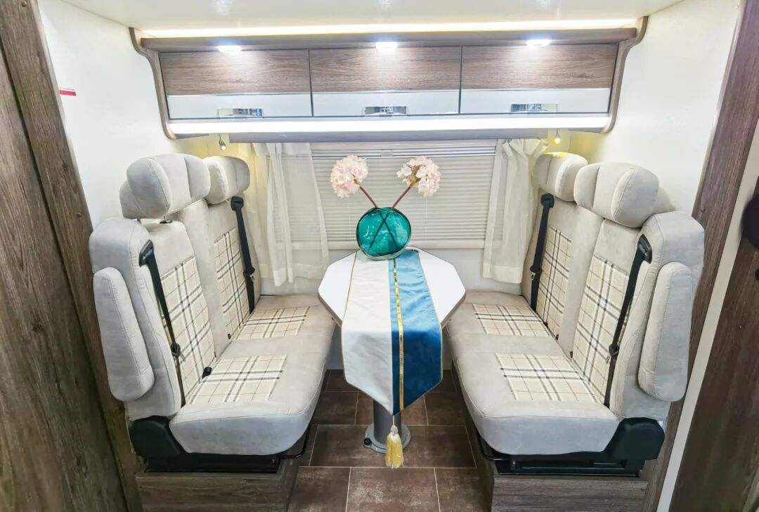 车身左侧拓展打开以后,是一组四人对坐沙发,尺寸挺大,可以满足4人在此休息,会客区座椅全部为乘用车标准改为会客区座椅全部为乘用车标准,带3C认证,安全更可靠驻车以后还可以把餐桌降低,变成一张尺寸约为1860*900mm的沙发床,可以满足一人休息。
