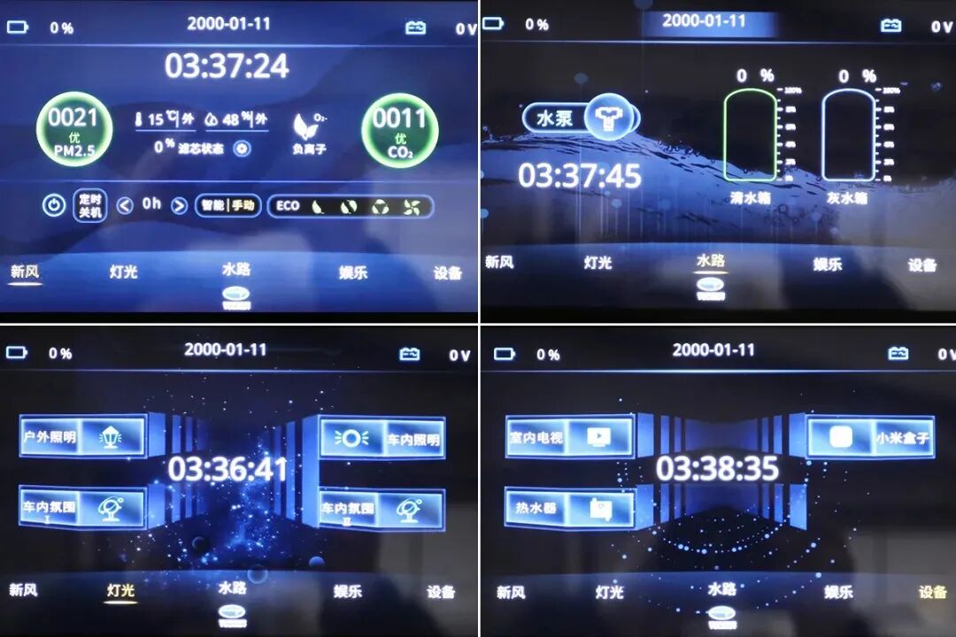 新款大屏幕内集成的功能UI界面也得到重新优化,大屏内包含新风系统、灯光系统、水路系统、娱乐系统以及设备的开关。这款车首次采用了新风系统+纳米光催化技术,简单说就是它能净化空气,除甲醛,杀菌,想一想似乎有那么点像“移动森林”的感觉,通过这款屏幕可以直观的看到车内空气质量,PM2.5指数,二氧化碳指数,车内车外的温度等等。娱乐方面,车内标配的小米盒子,接入4G/5G移动WiFi之后可以使用小度语音系统实现蓝牙听音乐,看电影等等娱乐。