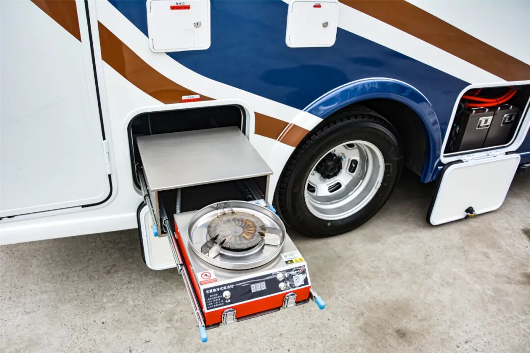 在外部功能性方面,这款车配备的也非常全面,除了常规的遮阳棚、外置花洒、贯通式储物箱以外,这款车还提供了一部燃油灶,可以直接从油箱汲取燃料,比较方便,另外在车尾部还提供了驻车平衡支腿,提升了驻车后的稳定性。在车身上方还加入了限高提醒系统,能够有效地防止碰撞限高、树枝等障碍物。中控联动欧式中门,与原车一键解锁,带踏步联动,更加便捷。