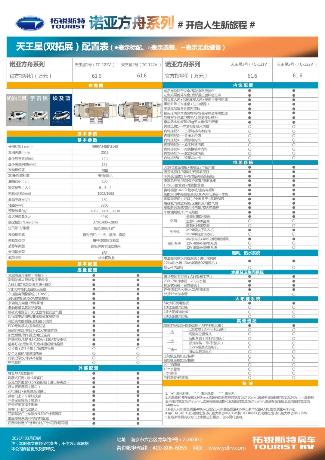 作为旗下高端C型房车,天王星1号一定程度体现了拓锐斯特的制造水平,以星系为元素是诺亚方舟系列的一大亮点在配置方面,车内选用多层实木家具,重新优化的灯光系统,高端的柜门把手,模块化的板材扣件,大容量冰箱,大容积水箱等等,在同级车型中足够有分量。诺亚方舟系列全系配置满满;诚意满满的天王星1号售价为61.6万。对于这个价格,除了各种房车基本的配置,配置也满满当当,该有的配置都齐全了。同时高颜值的外观也非常打动人心。在60万级别里,这辆拓锐斯特天王星1号不失为一个不错的选择。