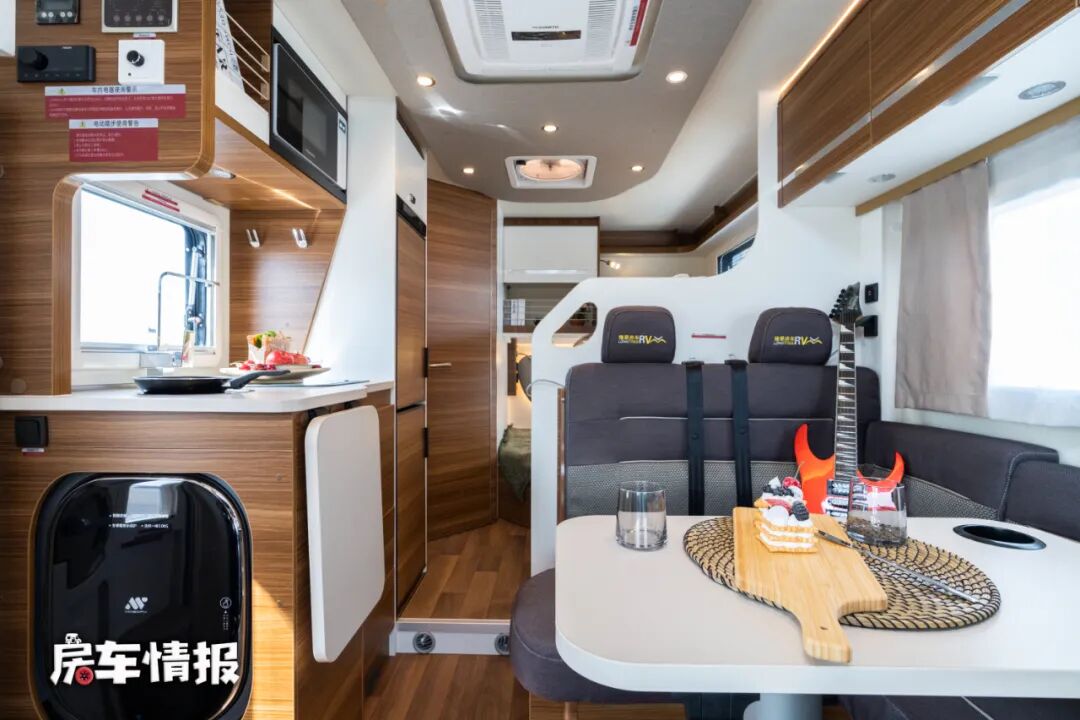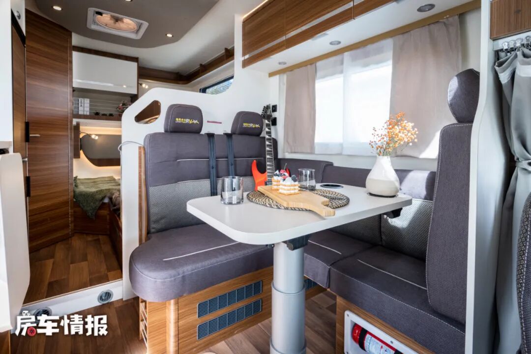 除了比较受欢迎的子母床设计,这款车的会客区也采用了当下较为流行的L型沙发座椅+升降餐桌的设计,配有三条安全带,加上主副驾驶座椅,日常行车时最多可以乘坐5个人。