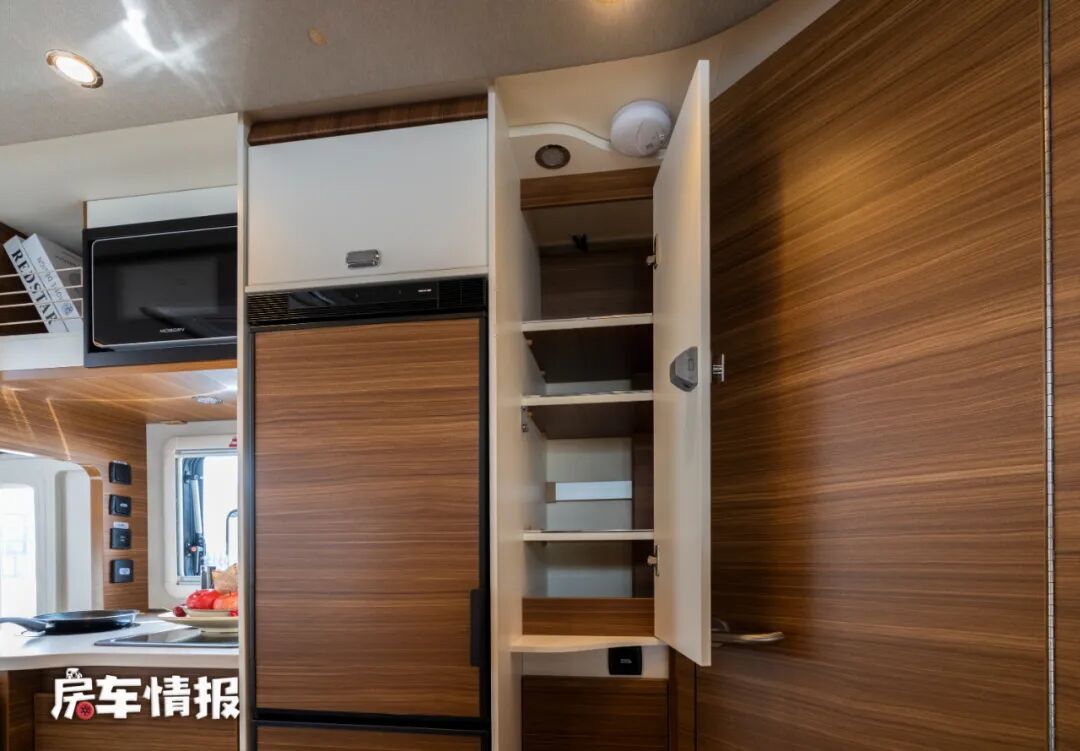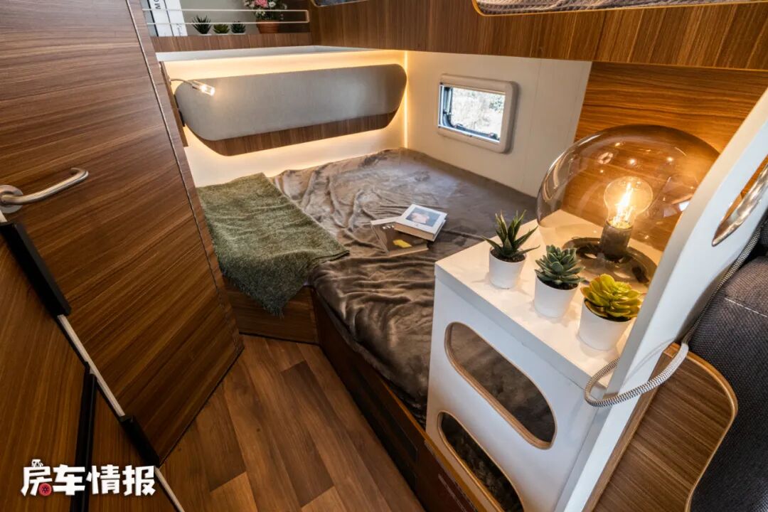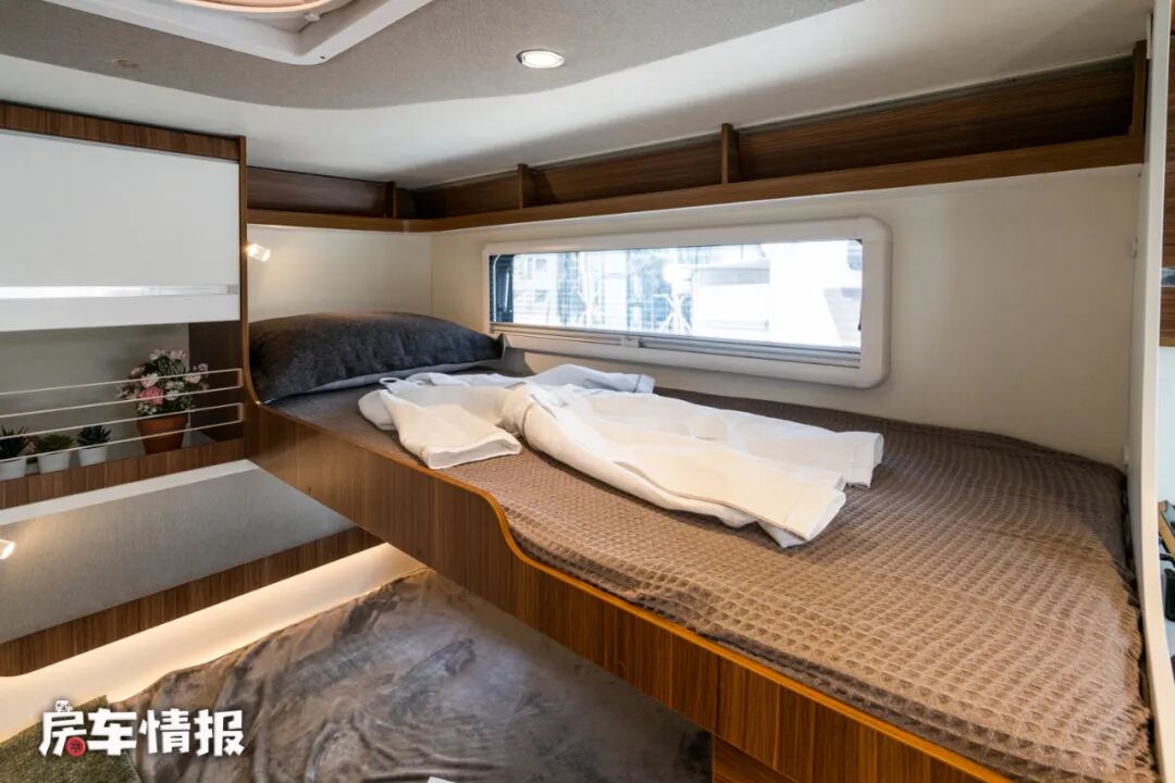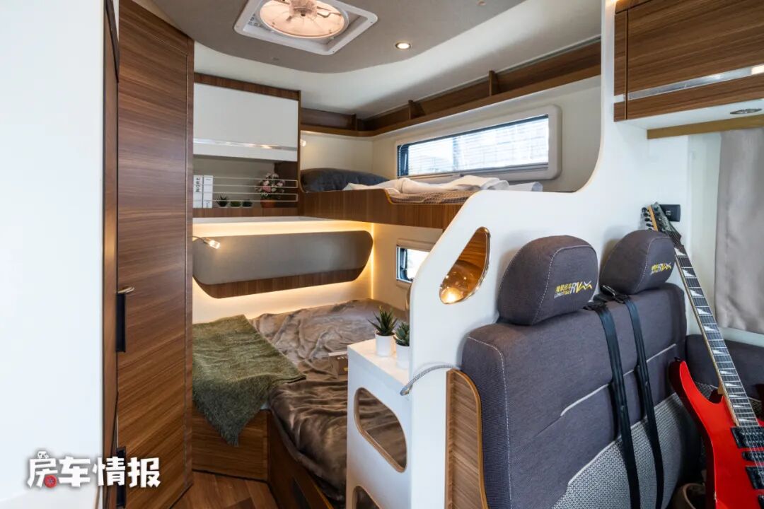 其实这款车的内部布局是采用了当下大家比较喜欢的纵置子母床的设计,就位于卫浴室的旁边,下方为双人床,上方为单人床,这样可以满足一家三口人的使用,不过上床采用的是固定的模式,所以整个休息区的储物空间比较少,但是旁边的一个小型吊柜,也能存放一些基础的物品。