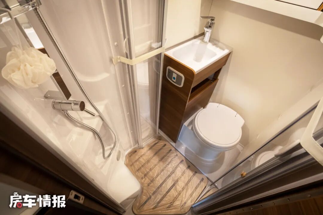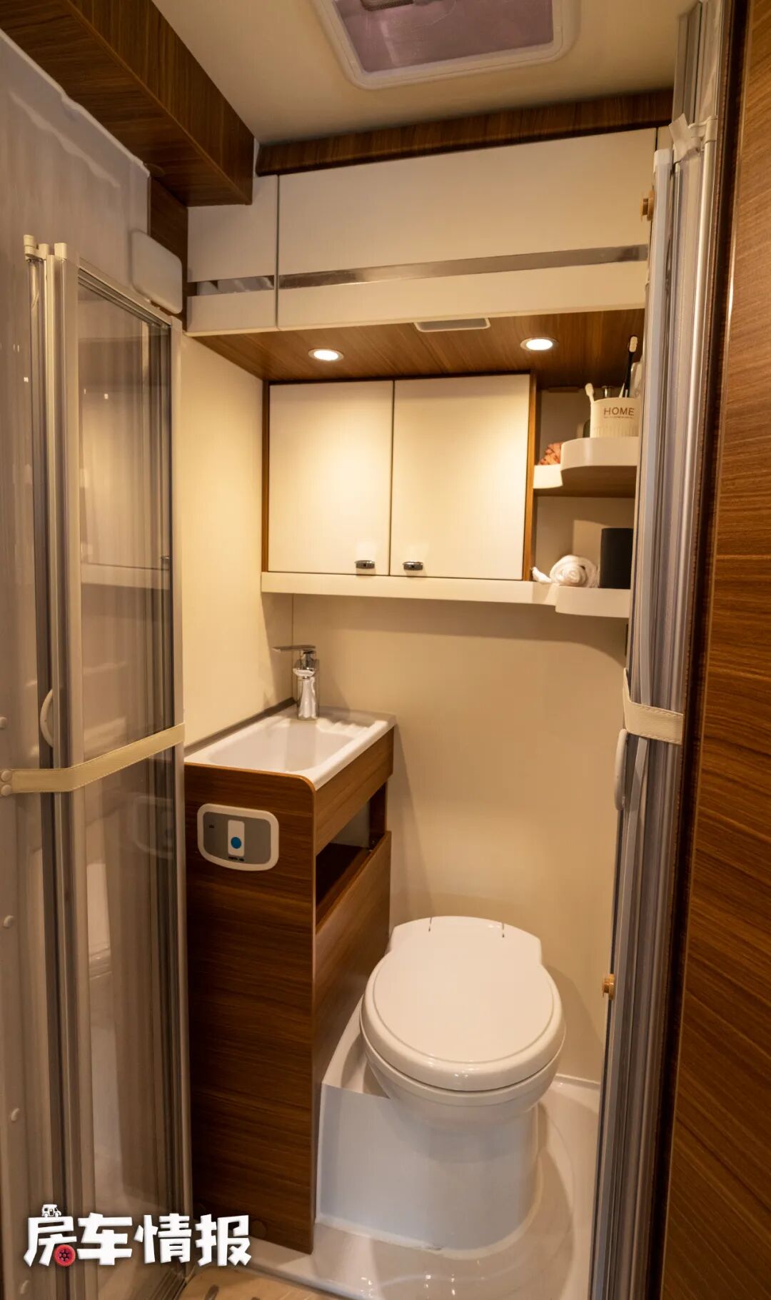 虽然同样是采用了干湿分离的设计,不过这款车内的卫浴室却是将淋浴间放在外侧,马桶和洗手台盆放在了内侧,我个人觉得,如果能换个位置会更好一些,这样内侧的人洗澡,也不会耽误外面上厕所和刷牙洗脸简单的洗漱。