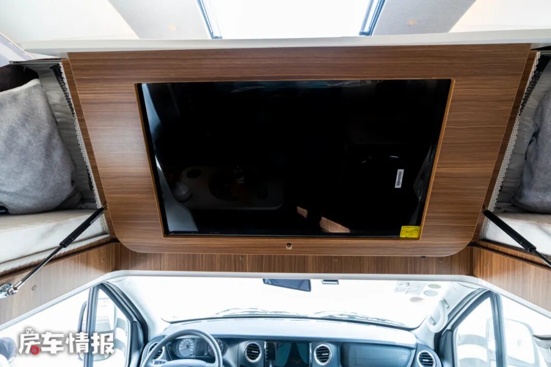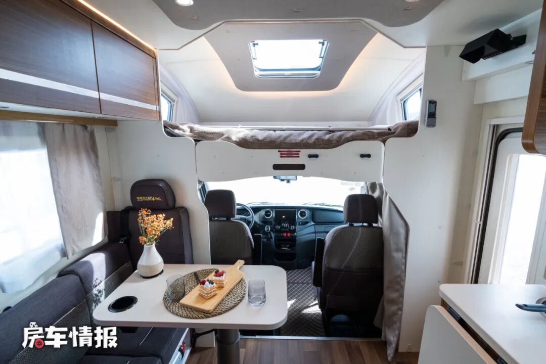 除了尾部的休息区之外,在最前方的驾驶室顶部,还带有一张标配的双人床,三面环窗的设计使整体看起来特别的通透,日常也能满足两个人的睡卧需求。