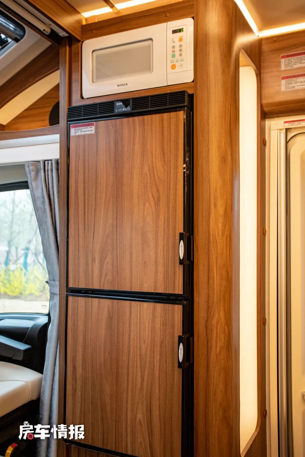 副驾驶座椅后方则是一台148L上下双开门冰箱和一台微波炉,能够满足日常分类存放食材的需求性。