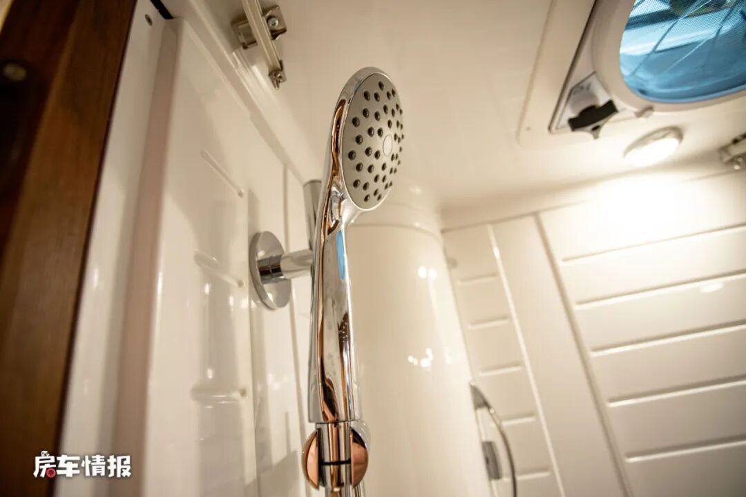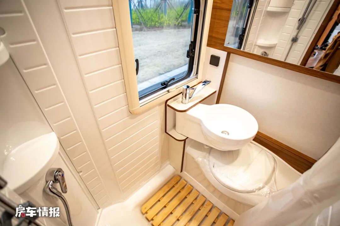 厨房区后方则是整辆车的独立卫浴室,内部使用了大量的吸塑件,可以有效的防潮防水,另外整体采用无胶的安装工艺,环保更耐用,得益于可旋转的洗手台盆设计,内部的空间还是非常宽敞的,在主流的房车中还是属于佼佼者的,另外内部还提供了固定式的马桶、独立的淋浴花洒、镜面储物柜、换气扇等,能够满足日常的洗漱需求。