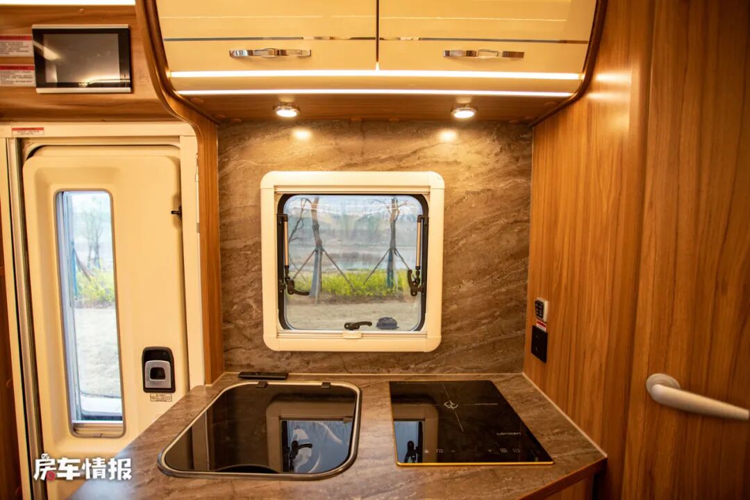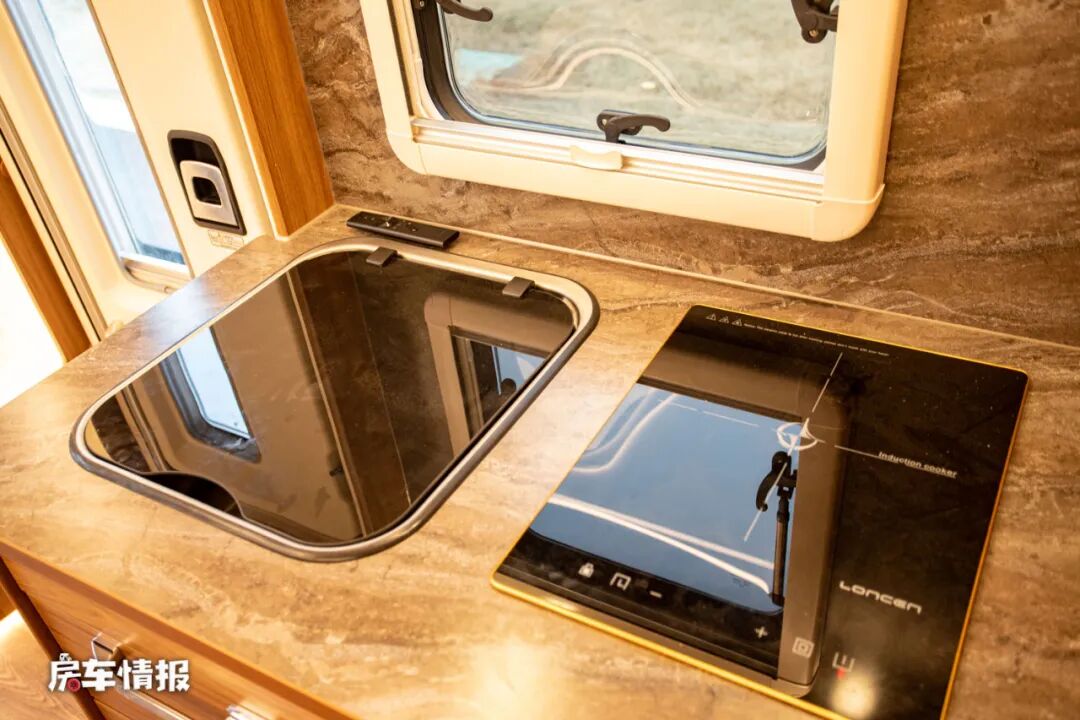 厨房操作台的台面都采用仿大理石的设计,看起来非常的有高级感,侧面还得有拓展的备菜区,台面上也配置翻盖的水槽和特制的电磁炉,能够满足日常烹饪的基本需求。